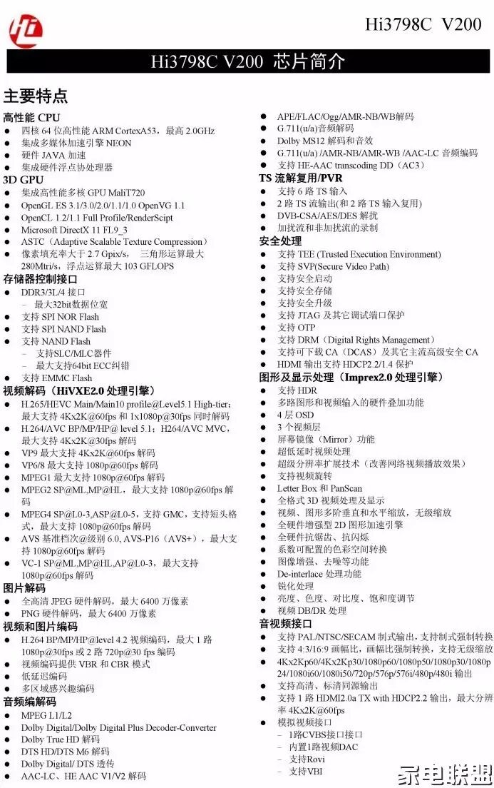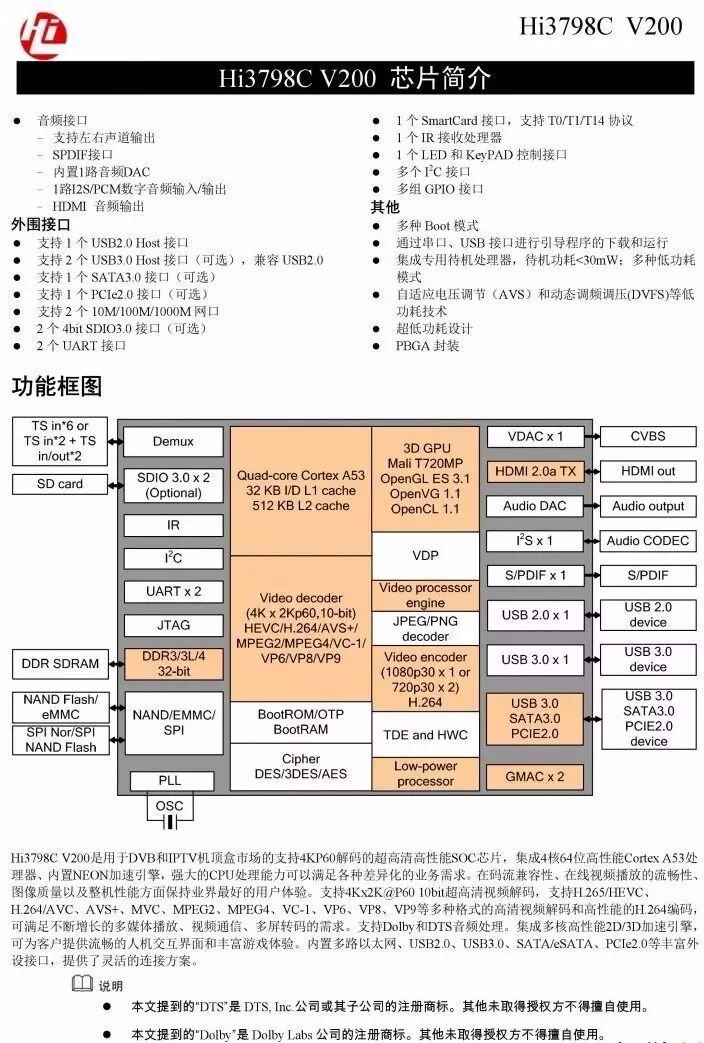Hi3798C V200 芯片關鍵特性包括: 提供業界領先的四核ARM® Cortex® A53 64-bit 中央處理器,運算速率達到15000DMIPS ,為運營商提供可以基於Android 智能操作系統和HTML5 技術開發多媒體應用的平台,從而提供超凡的電視體驗。業界首款為DVB 數字視頻廣播和IP 電視領域提供的集成Dolby Vision HDR 技術的機頂盒芯片解決方案,提供一流的沉浸式視頻品質體驗。HiVXETM2.0 視頻引擎支持2160p60 HEVC 和VP9 解碼,1080p PIP 和轉碼能力,提供靈活的視頻分享和播放服務。基於多核ARM® MaliTM-T720 圖形處理器,支持OpenGL ES3.1/2.0/1.1/1.0 OpenVG1.1 、EGL 技術以及ImprexTM2.0 圖像質量引擎,針對Android 遊戲生態系統而優化,讓運營商能夠將極致的遊戲服務提供給終端用戶。新一代安全引擎,支持以TrustZone 為核心的secure video path 技術和基於硬件實現的視頻水印技術,充分滿足最新MovieLabs 對超高清優質內容傳輸的要求。提供待機模式和工作模式下超低功耗設計技術。將智能手機芯片低功耗方案的技術積累應用於海思機頂盒芯片產品,集成節能產品設計中先進的低能耗技術,最大限度地減少對環境的影響。完備的SDK 交付方案,包括Android TV 、Linux® 中間件以及RDK ,幫助運營商針對不同的屏幕要求,快速地部署服務和應用。經過5 年多的積累和優化迭代開發,海思提供的Android 智能係統機頂盒方案SDK 具有非常好的穩定性和易用性。