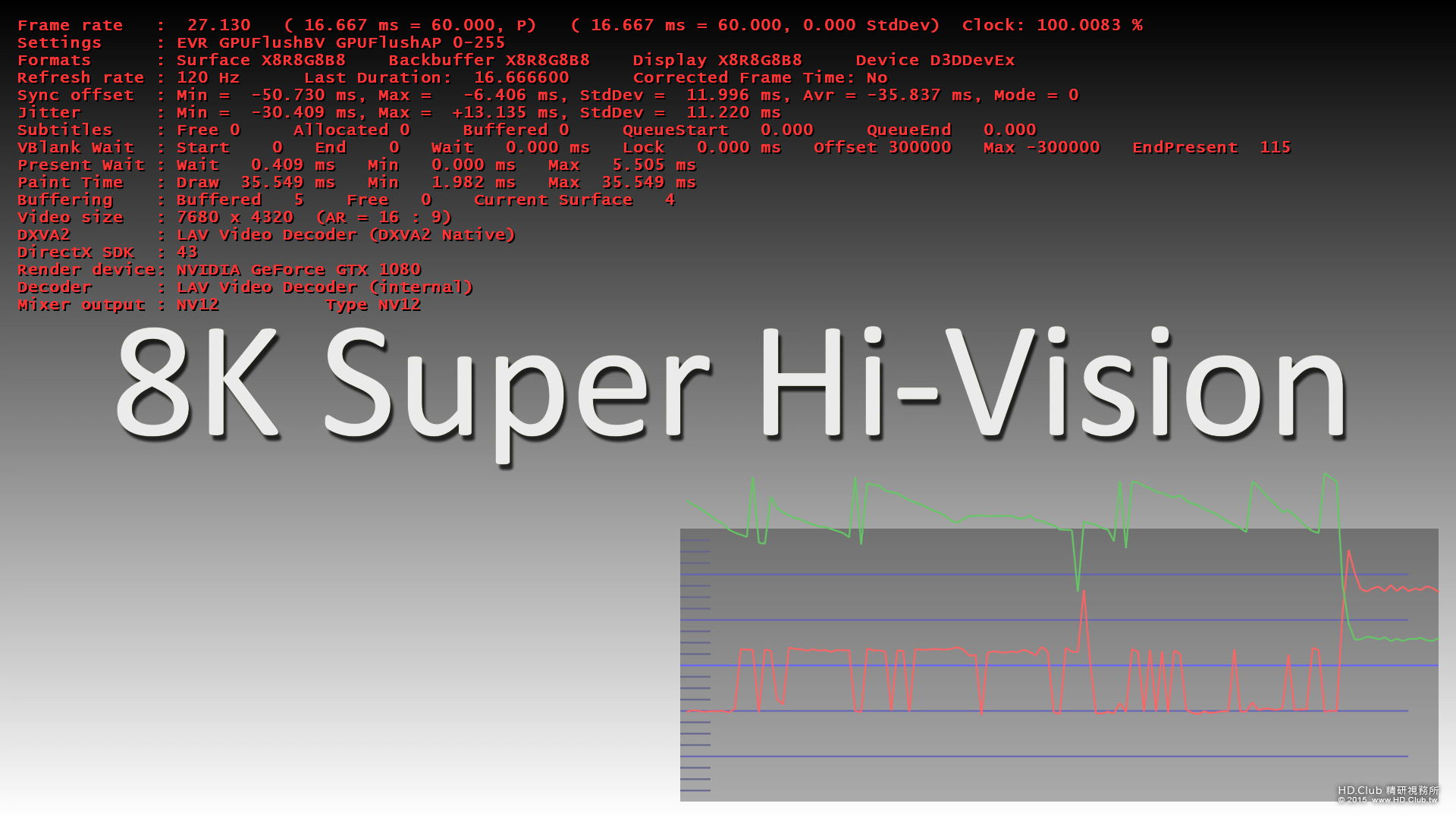 KOBSS 發表於 2016-6-19 16:09 以 GTX1080 實測 8K 的 HEVC 以及 HEVC10 影片 7680x4320 29.97FPS HEVC & HEVC10 均無問題, 順暢播放