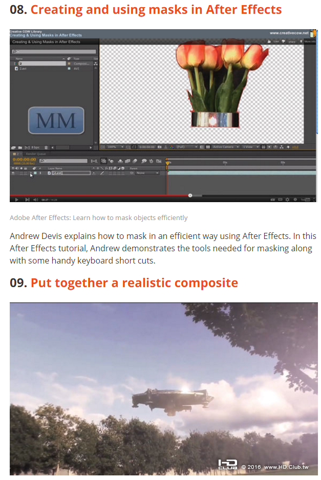 這些教學雖然不完全是文章作者自己的產出,分類與選擇倒是滿用心,從入門、遮罩、合成、動態、3D、文字、特效等,差不多整個AE的基本原理全部介紹了。