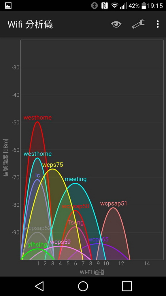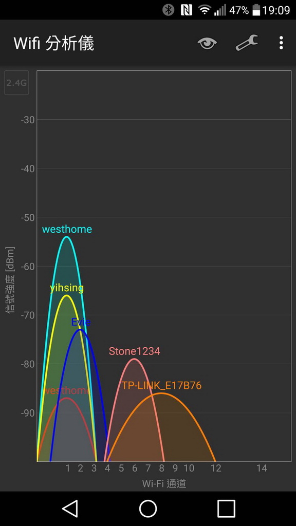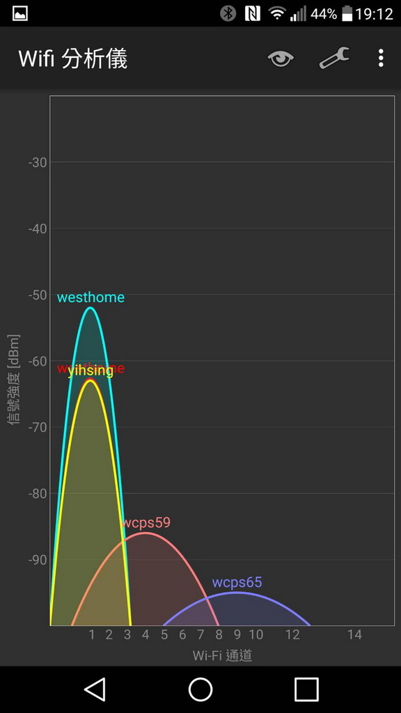 視聽室的訊號強度(westhome),藍綠色(EX750)可以達到 -50 到 -60 dBm,