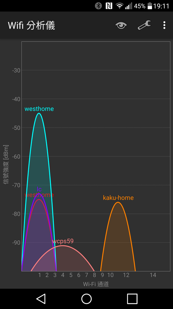 紅色(原來的無線基地台)距離比較遠,只有 -80 到 -90 dBm