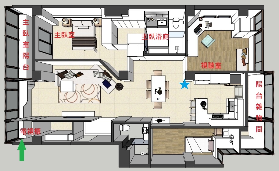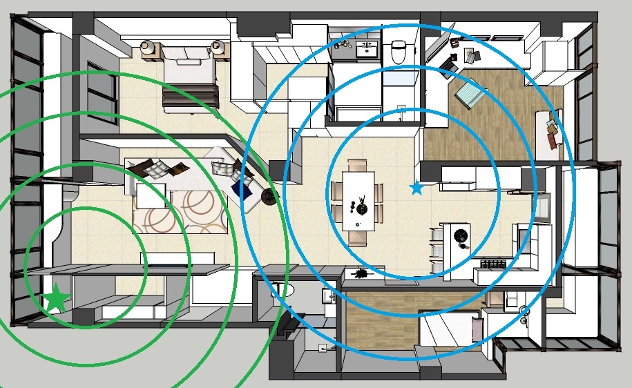 實測: 以下為HDClub站長家的平面圖,綠色箭頭是原來無線基地台的位置,為了滿足視聽室(圖中右側)內部無線訊號的需求,我們將EX750安裝在藍色星號的位置 然後分別測試屋主常用wifi的位置的訊號強度