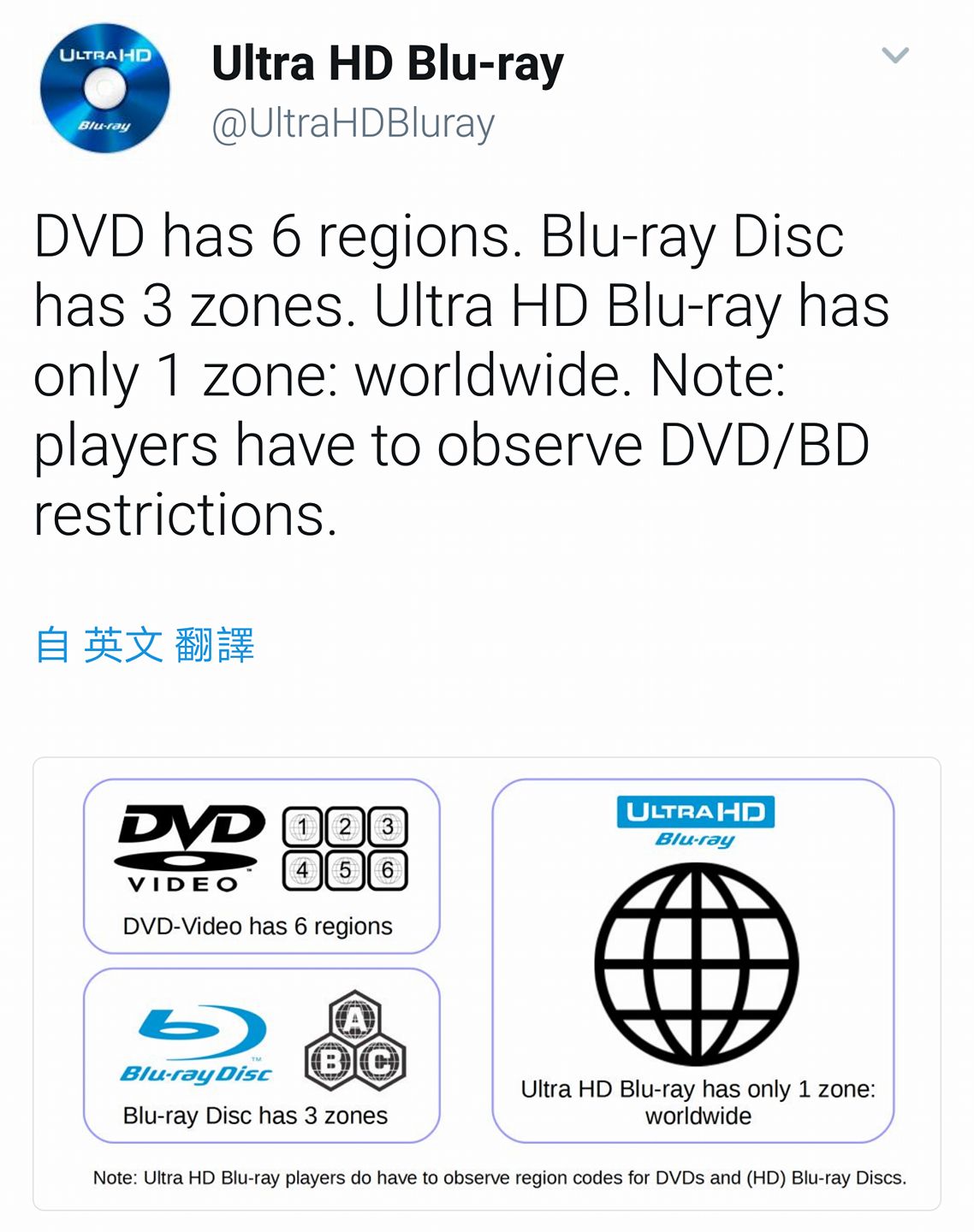 4K Ultra HD Blu-ray自發表以來熟知規格的消費者都明確知道4K Ultra HD Blu-ray的區碼,不再像是DVD(6個區碼)、BD(3個區碼)那樣的區分,