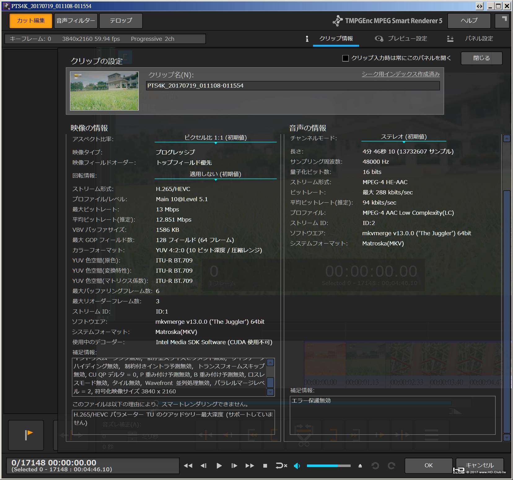 Open GOP, プログレッシブシーケンス, VBV 有効, 最小 CU サイズ = 8, 最大 CU サイズ = 64, 最小 TU サイズ = 4, 最大 TU サイズ = 32, イントラ TU のクアッドツリー最大深度 = 5, インター TU のクアッドツリー最大深度 = 5, 非対称分割モード無効, SAO フィルター無効, PCM 符号化無効, 強イントラスムーシング無効, 依存型スライスセグメント無効, サインデータハイディング無効, 制約付きイントラ予測無効, トランスフォームスキップ無効, CU QP デルタ = 0, P 重み付け予測無効, B 重み付け予測無効, ロスレスモード無効, タイル無効, Wavefront 並列処理無効, パラレルマージレベル = 2, 符号化映像サイズ 3840 x 2160