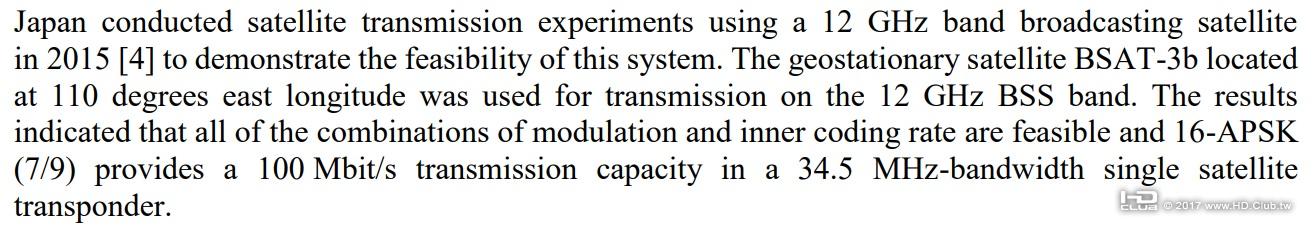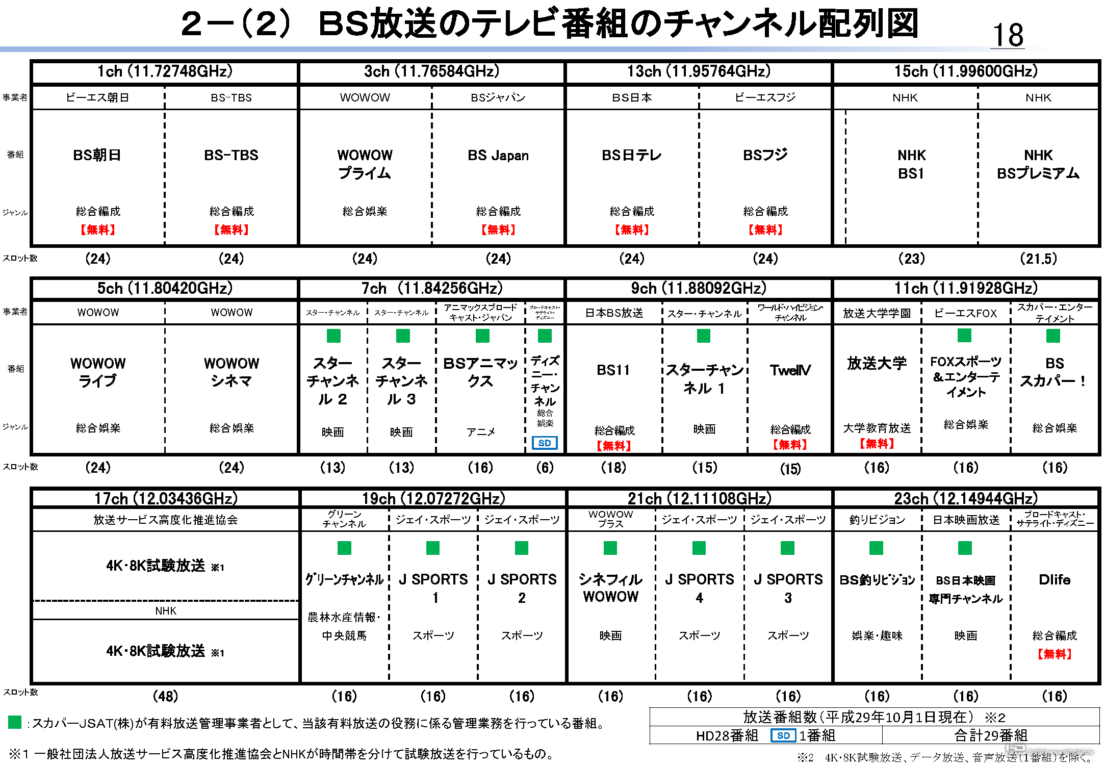 參考資料: 日本総務省 - 衛星放送の現状 PDF , 公視 - 日本的超高畫質電視發展現況 PDF , International Telecommunications Union (ITU) - Satellite transmissions for UHDTV satellite broadcastong PDF |