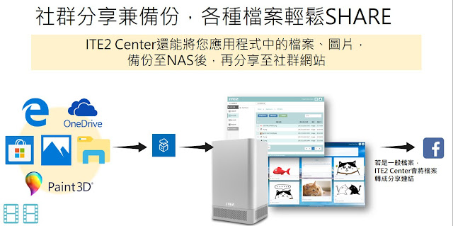詮力科技 ITE2 NAS NE-201 有一個很好用的軟體,叫做 ITE2 Center。 ITE2 Center 的功能除了可以幫 NE-201 的任何資料夾中的檔案做定期差異備份外,還可以利用 ITE2 Center 將 NAS 的照片和影片輕鬆分享到 FB 上,當然 ITE2 Center 還可以看影片看聽音樂。