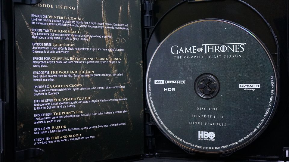 算起來這應該是電視劇權力遊戲實體藍光的第三度(版本)發行,沒錯權力遊戲將發行4K UHD版本,稍早HBO正式發布新聞稿宣布,權力遊戲第一季4K UHD BD預計在2018年6月5日於北美地區開始販售,4K UHD BD版本配置Dolby Vision以及 Dolby Atmos。收錄的花序內容如下方。要注意的是從封面來看似乎是只有4K UHD BD,與以往的4K UHD加BD一同販售的模式不太相同。不過是否如此還有待查證。