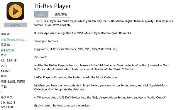 ▼但如果是高音質音樂檔怎麼辦?只要從 NAS 端下載 Hi-Res Player App,可支援 DSD 音樂播放。