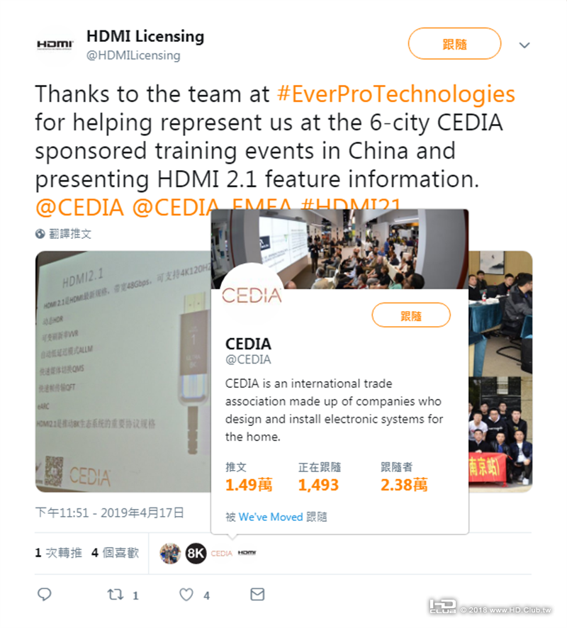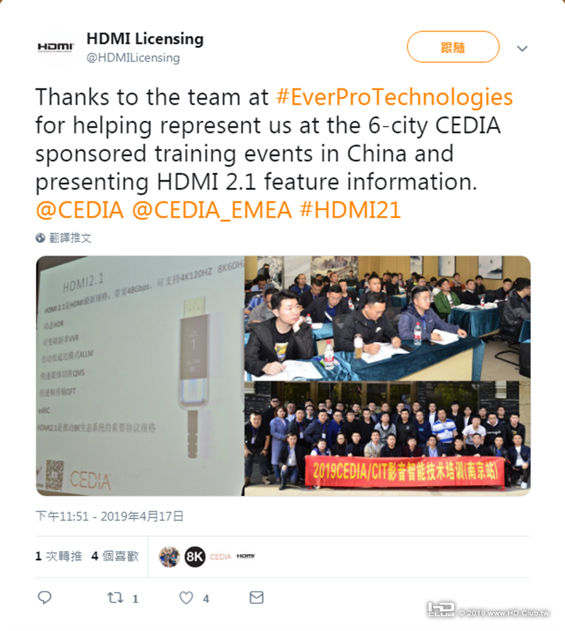 感謝#EverProTechnologies團隊在中國代表我們參加於6個城市、由CEDIA參與主辦的培訓活動,並且提供HDMI 2.1的功能信息。同時,HDMI Licensing還@了CEDIA和CEDIA_EMEA,再以“HDMI21”作為關鍵詞展示。