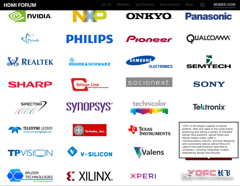 傳統金屬線材受帶寬和距離限制,遭遇傳輸瓶頸等問題後,HDMI協會亟需具備光纖研發/生產經驗的廠商加入,共同參與標準/協議的製定。於是,FIBBR品牌母公司長飛光纖在2017年加入了HDMI協會,成為協會會員。在HDMI Forum官網的Member頁面,就可以看到長飛光纖(YOFC)位列其中。