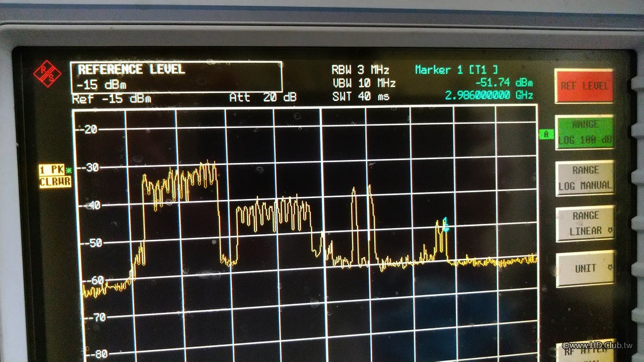 圖四是 LNB輸出的RF經光調變後傳輸500米再接上-14dB衰減器後的波形: