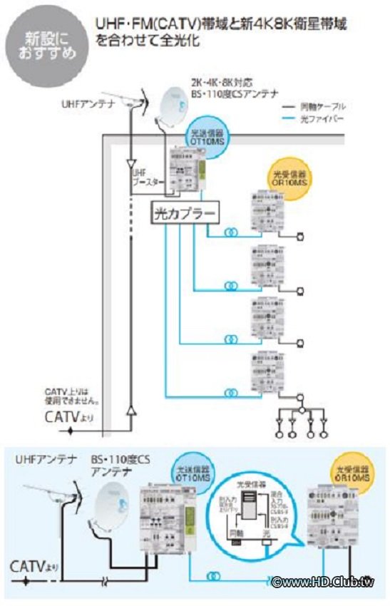 RF轉光纖器材有什麼功用?什麼是TVRO第二次產業革命? 1、日本BS/CS衛星的共用頻寬高達3224MHz,因為頻率高不利於纜線傳輸,所以日本DX ANNTENNA公司為了解決大樓系統在處理3224MHz頻寬的困難,在2018年9月BS/4K/8K開播前就公布了一款對應BS/4K/8KRF的RF轉光纖的傳輸系統。就是利用光纖傳輸幾乎無損耗的特點,來解決公寓和大樓建置CATV+BS 4K/8K高頻寬的問題。 在日本本土接收BS/CS兩系統功率相差不大,基本可忽略載波的差異,但在台灣、台中CS衛星的功率本來就比BS低又有中國衛星的干擾,為了避開干擾,接收後兩顆衛星的載波強度就差了8dB以上,兩個系統載波差距大,除非很謹慎的作斜率調整後再放大,否則為了補償線損和分配損失,經過2、3級放大後很容易因交叉調變而使得系統崩潰得難以接收到完整的頻道,這就是以往台灣業者為大樓公寓建置BS/CS系統經常碰到的困境。