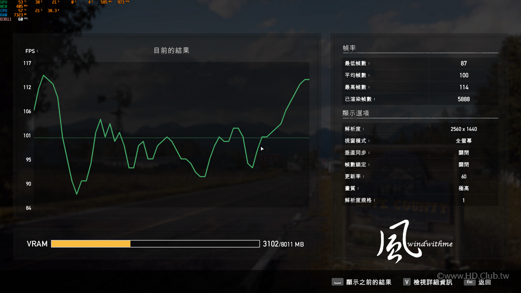 2560 X 1440幀數 => 最低87、最高114、平均100。