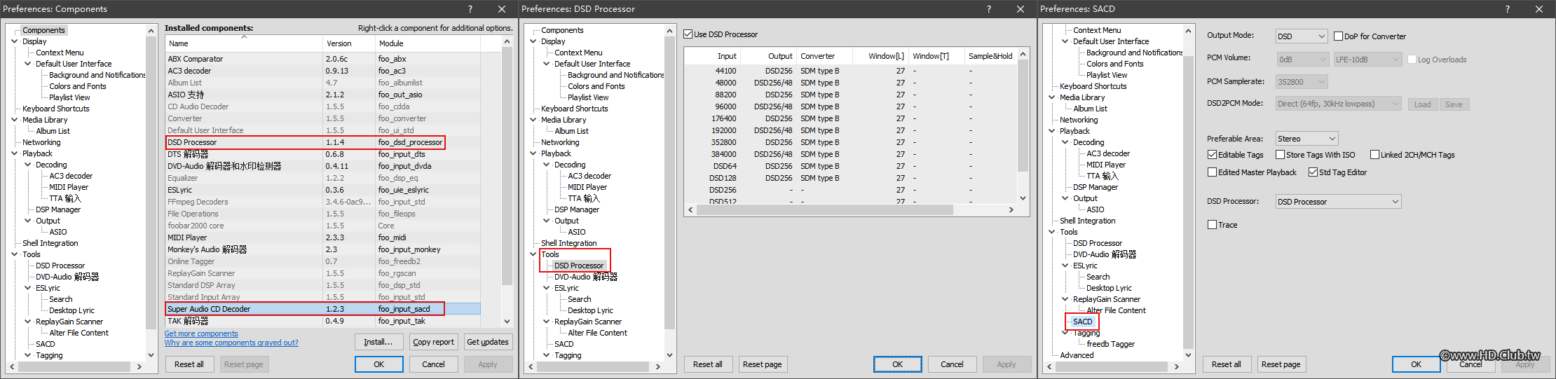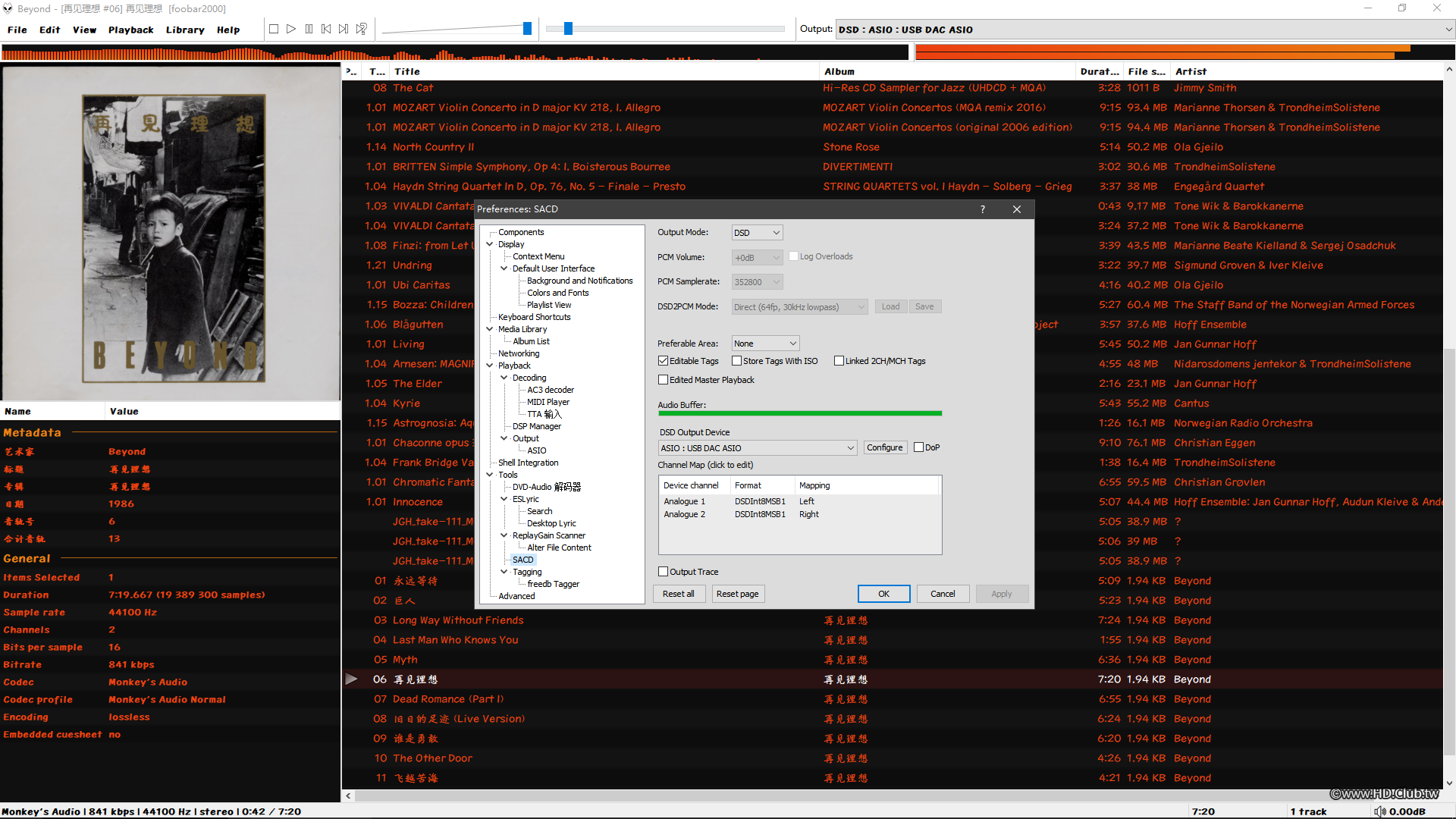S.M.S.L M400的音量調節範圍是從0到80,喇叭的音量電位器,一直以來我都打在三點鐘的位置上,超過這個位置底噪會變得可聞。但是駁接M400後開到最大,底噪都不可聞!嚯嚯,厲害了。M400音量開到50,就已經滿足我聽音的需求了。播放軟體是常用的FOOBAR2000 + Super Audio CD Decoder 0.9.6,輸出選定DSD:ASIO:USB DAC ASIO.