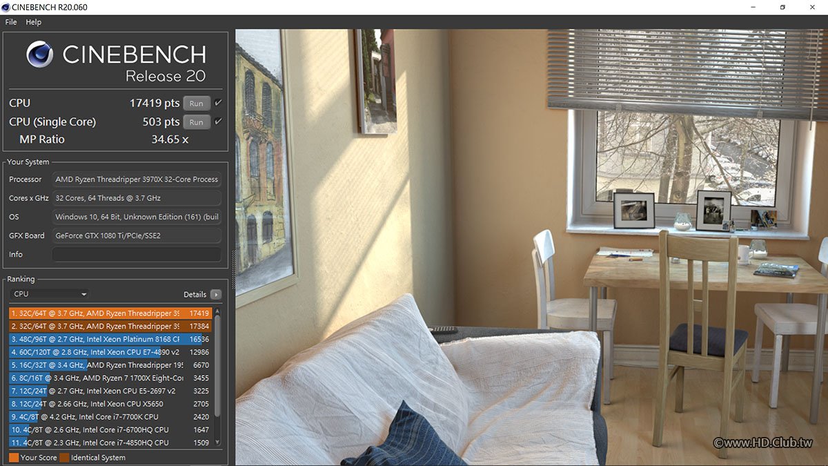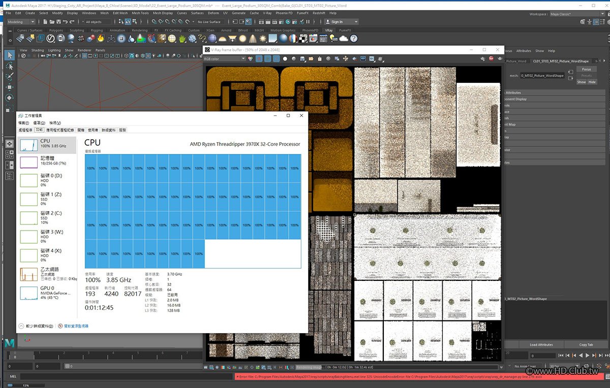 另外,有另一位友人幫忙測試了V-RAY Baking算圖,純CPU算圖和純GPU算圖,Threadripper3970X的算圖速度大約匹敵接近用2張1080Ti一起算的算圖速度,但礙於是使用其公司的商業案子檔案做測試,不方便PO完成圖