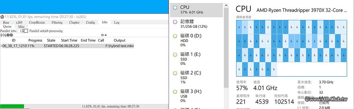 從上面測試可以看到前面我說的其中一個選購時考量的問題,到目前為止後製軟體對多核心的支援還沒有很完全,像TMPGEnc和Hybrid Encoder就只能使用到32核心(或32執行序),測試可以看出來即使沒辦法完全使用所有執行序,整個運算速度在TMPGenc還是提高了4.7倍,在Hybrid Encoder提高了4.58倍。