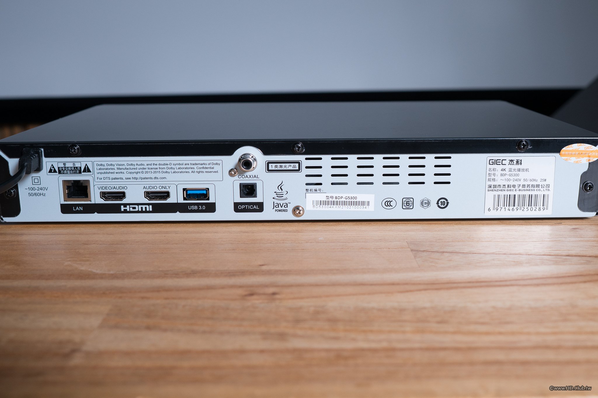 同系列中G5300的定位屬較平價的路線,所以在I/O端子上並沒有配置發燒玩家愛用的XLR、RCA。 但是普羅大眾常用的我們都有。 端子的配置從右至左:(上)同軸(下)光纖〉USB(高速傳輸3.0版)>HDMI(聲音輸出)〉HDMI(聲音+影像)〉網路〉電源。 比較可惜的應該就屬這點。電源線的配置為固定式,無法更換電源線,這會讓玩家們少了一項昇級的樂趣。 但是有聽幾位玩家分享,還是有機會可以改機。實際上怎麼改?有機會我再向這幾位玩家們請教,而且聽說昇級後,影音效果都大大的提昇。 HDMI端子的部份,我們有沒有發現,近年來不少機器都將HDMI雙輸出視為基本的配備。為何要這麼做呢? 相信不少玩家們的環繞擴大機還未支援4K HDR(HDCP 2.2)。 但是機器沒壞、為了支援4K而換一台環繞擴大機,考量預算。所以遲遲不敢下手, 這時播放機的廠商們貼心的為我們設想到影音分離,一個port輸出給顯示器,另一個port((HDMI 1.4)輸出給擴大機。 這樣可以解決擴大機無法支援的問題。最左邊網路孔的功能除了讓使用者可以透過網路昇級韌體外, 利用串流的概念。我們可以讀取電腦中的音樂檔、或是NAS上的影音資料庫。這樣的玩法,在音響界已經行之有年,所以不多作介紹。
