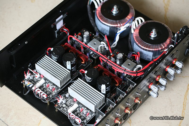 AD4.320內部其實有兩台立體聲後級擴大機線路,後級擴大機線路是Starke Sound宣稱自己設計的D類後級擴大機線路,後級擴大機板子上面也有Starke Sound的字樣,其工作頻率為600kHz。很多人一聽到“D類後級擴大機”這個關鍵字的第一反應就是開“腦放”,不知道自己有沒有聽過就說“聲音硬,粗”一類的評論。實際上,D類後級擴大機並不是罪,通過技術手段來完善,一樣可以有好的聲音。這款AD4.320的聲音就讓我覺得很滿意,不僅溫暖,細節反應多,背景乾淨,還有優秀的控制力和瞬態反應速度