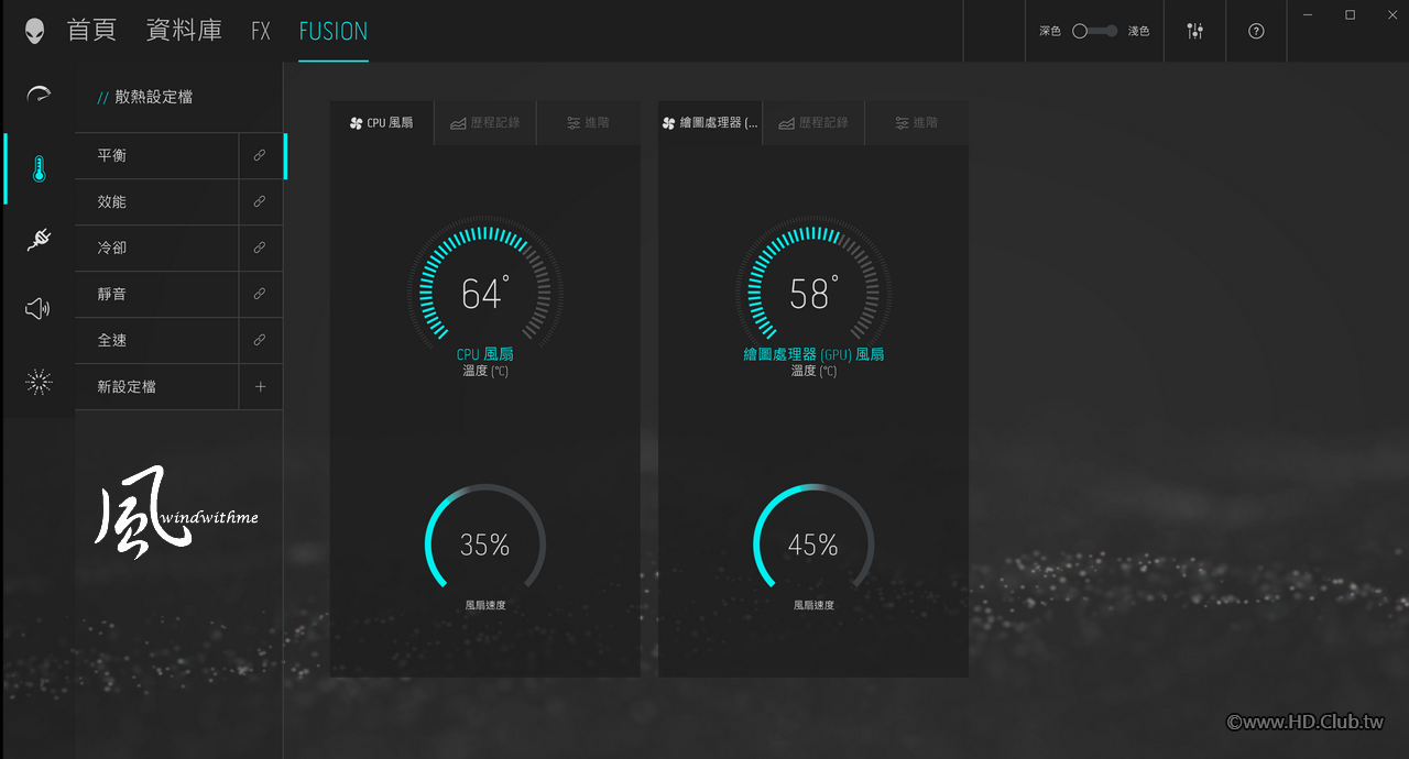散熱模式共有5種,平衡、效能、冷卻、靜音、全速。