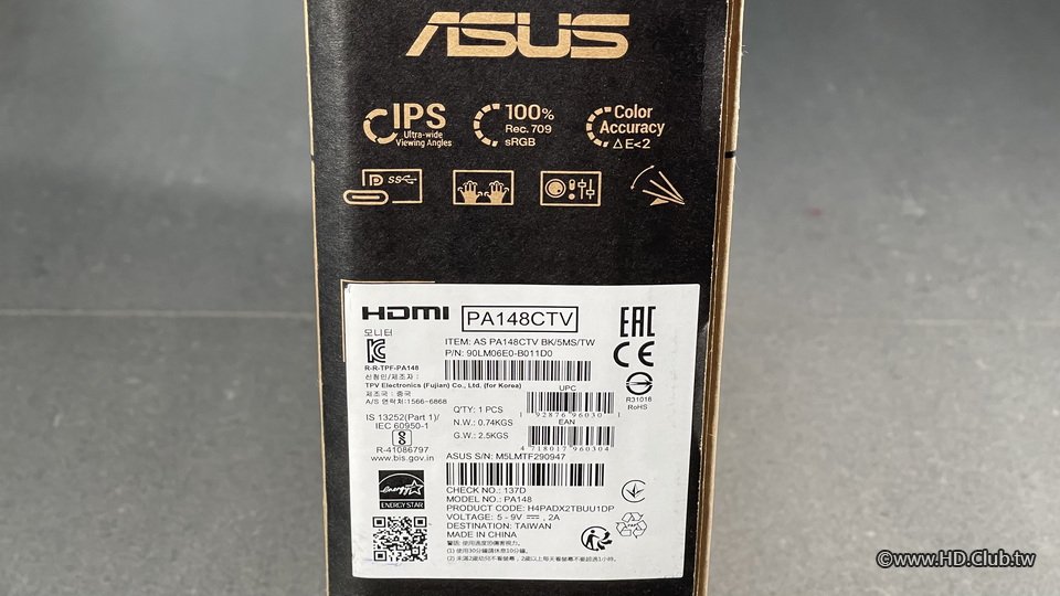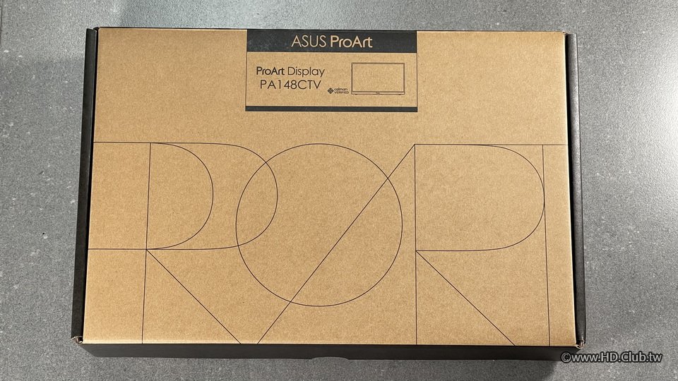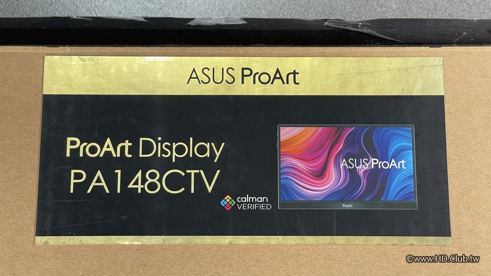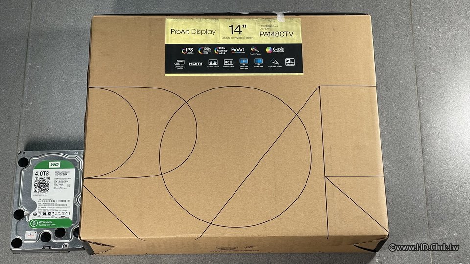 沒想到這次研總部收到的 ASUS ProArt DisPlay PA148CTV,完全符合以上的需求,這個螢幕在年初台北的 CES (2021/01) 就已經發表,可能是疫情關係延後上市了。讓我們開箱慢慢欣賞,拿一顆 3.5 吋硬碟與包裝外箱做個比較,看到這個顯示器被歸類於華碩的 ProArt 系列就知道是針對專業創作者而設計,