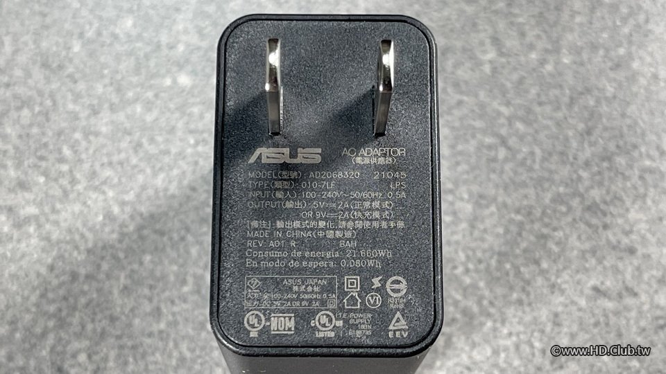 黑色變壓器,插腳不可收折,輸入為 100-240V 國際電壓,輸出分為兩個檔位,5V2A=10W 或是 9V2A=18W (快充模式),