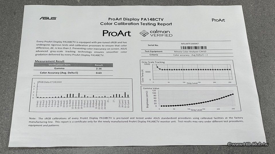 最重要的來了,ProArt 信封中可以取出國際色彩標準的 Calman 認證書,PA148CTV 也是全球首部通過 Calman 認證的可攜式顯示器,