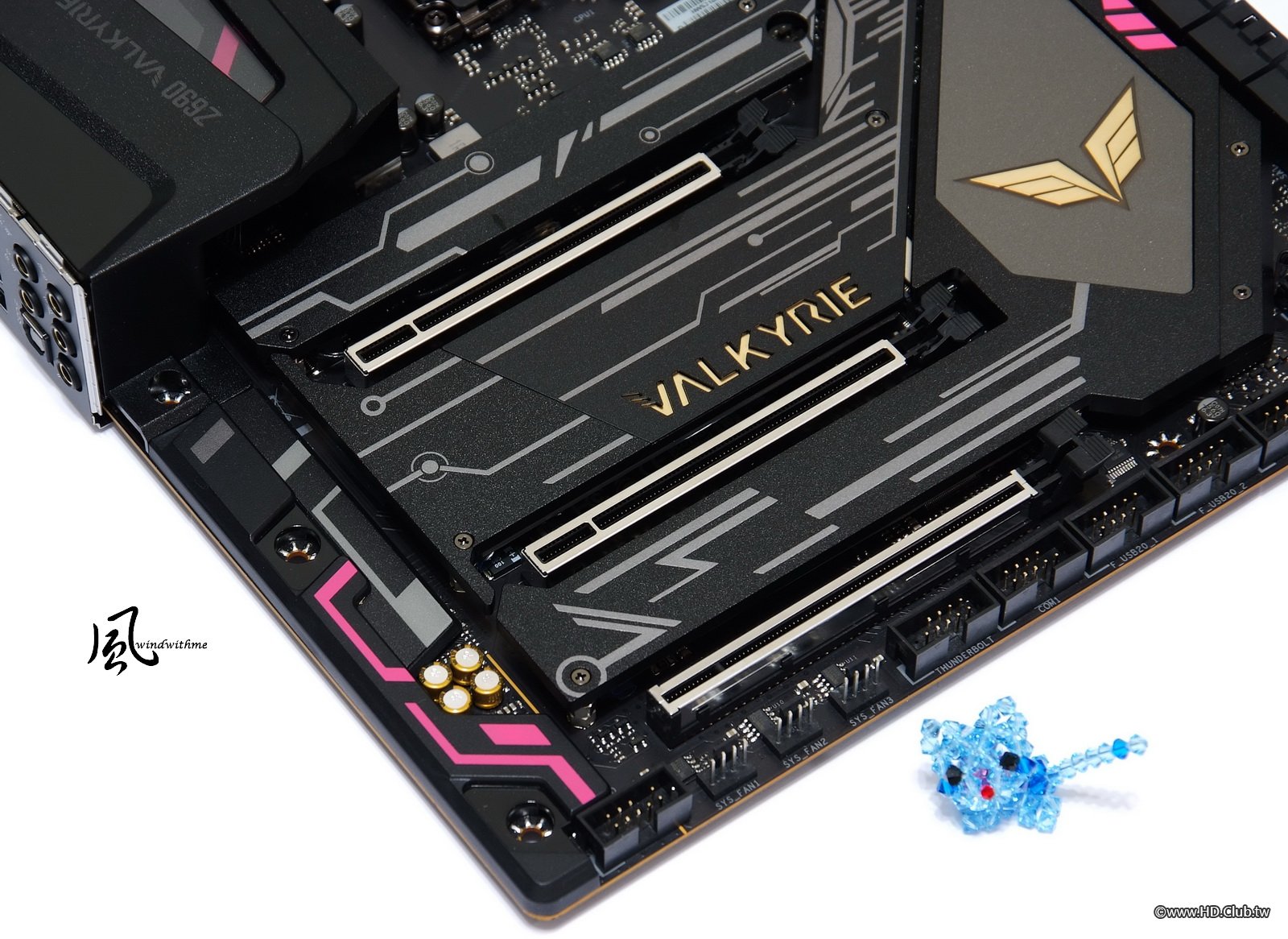 整片Z690以黑色為主體,搭配金色VALKYRIE圖型字樣與桃紅色線條點綴。