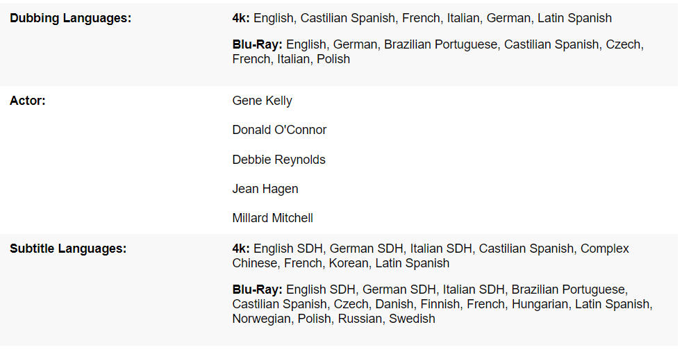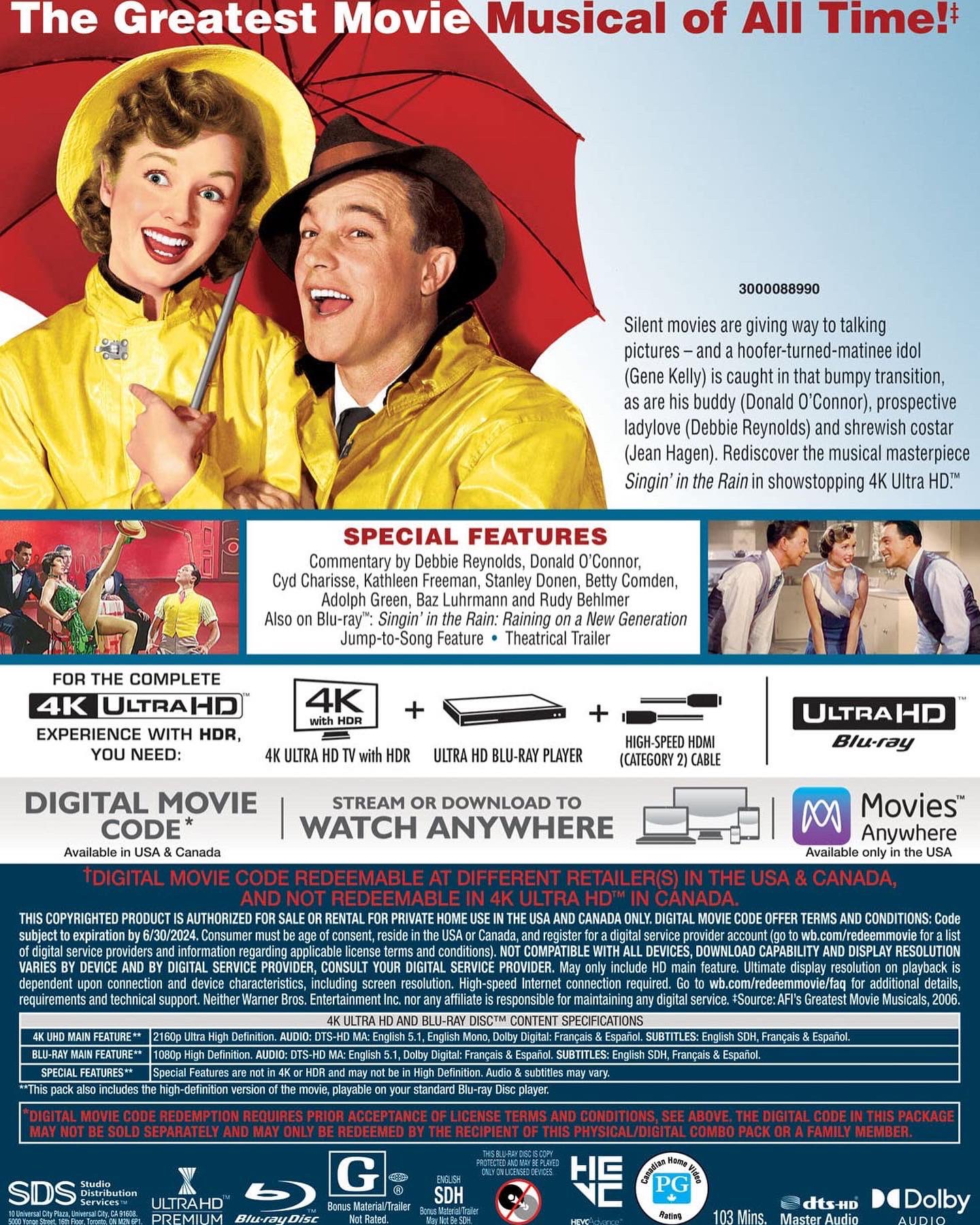 - Commentary by Debbie Reynold, Donald O'Connor, Cyd Charisse, Kathleen Freeman, Stanley Donen, Betty Camden, Adolph Green, Bad Lurhmann and Rudy Behlmer.