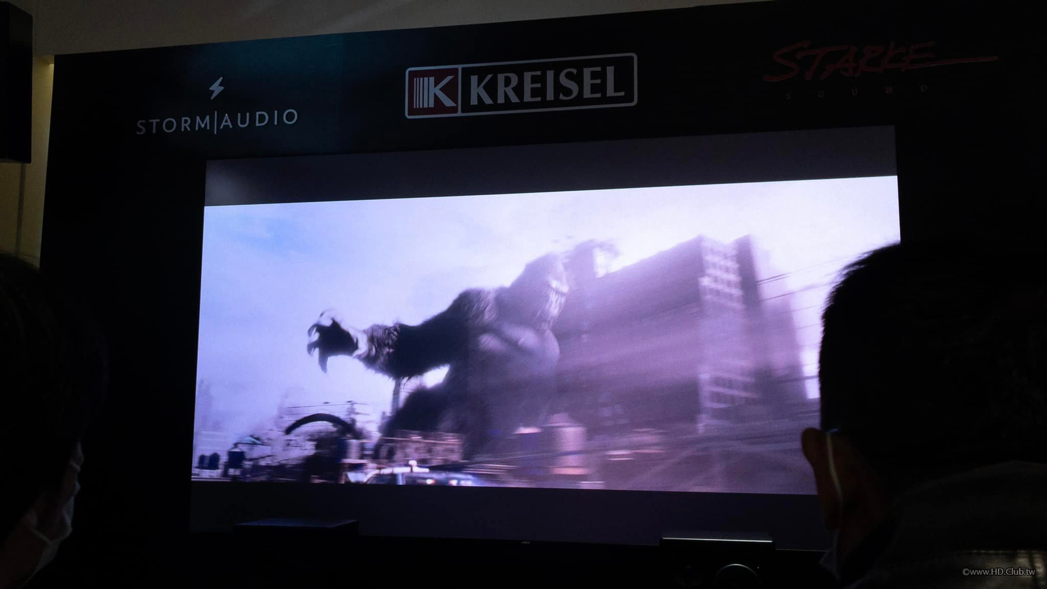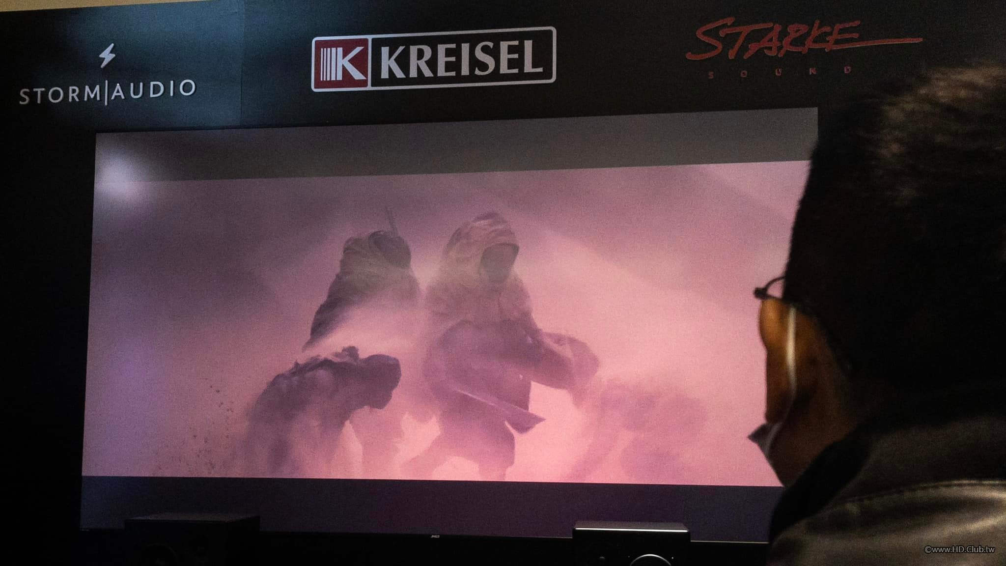 當天主編搭配堅果159% DCI-P3超短焦雷射投影機豐富色階的畫面(我覺得現場最超值的設備之一,可惜手機拍不出那鮮豔動人的豐富色階,拍謝)來展示整套KK喇叭+Push Pull堆疊低音柱/Starke後級/Storm Audio AV Processor這套核彈級的劇院,聆聽完除收穫良多外,也非常驚訝家用劇院在現場有限的空間中竟然可以帶給我電影廳般的臨場感受!