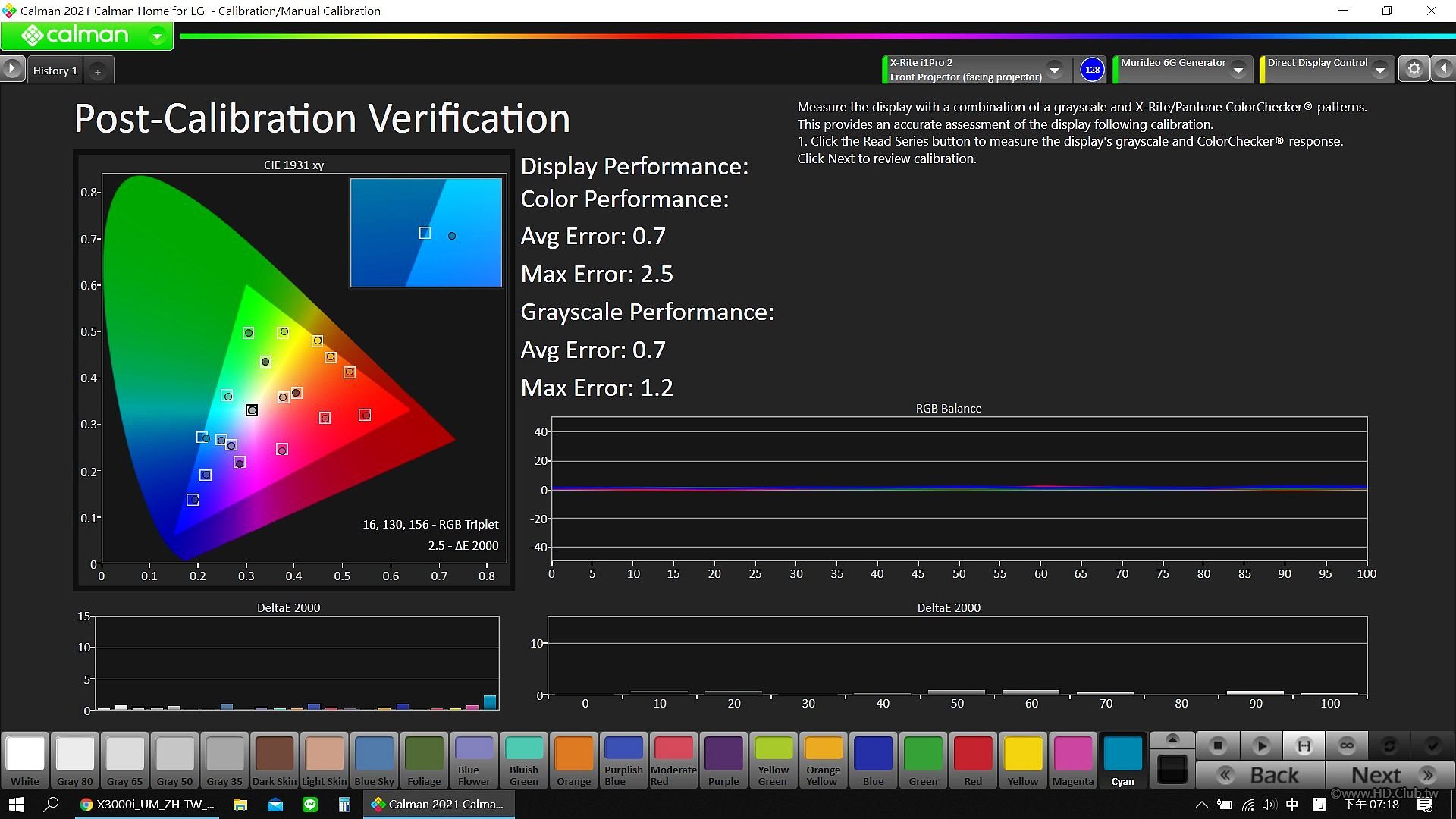 再強調一次!BENQ在家庭用機上一直致力於推廣標準色彩。而且每一台出廠的家用機逐台校正。所以我們在拿到機器時,都會附上一張簡易的量測報告。所以我也順手量了一下手上這一台x3000i。由於這一台是DEMO機,數據非常完美,量產機也許會差一點點,但是以往的經驗,誤差值對都在deleta3以內。肉眼無法分辯差異。
