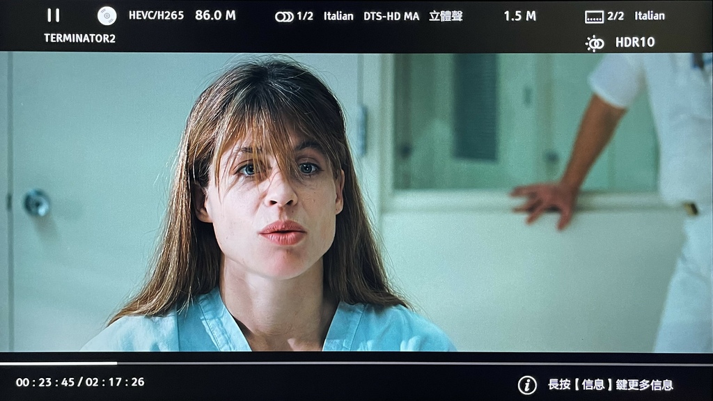 ▼按下遙控器上的資訊 Info 按鍵,畫面顯示影像流量是 86 Mbps,真的相當高,Sarah Conner 的衣服質地與頭髮細絲都可以清楚看到,HDR10 也被啟動,色彩柔和,膚色相當自然,