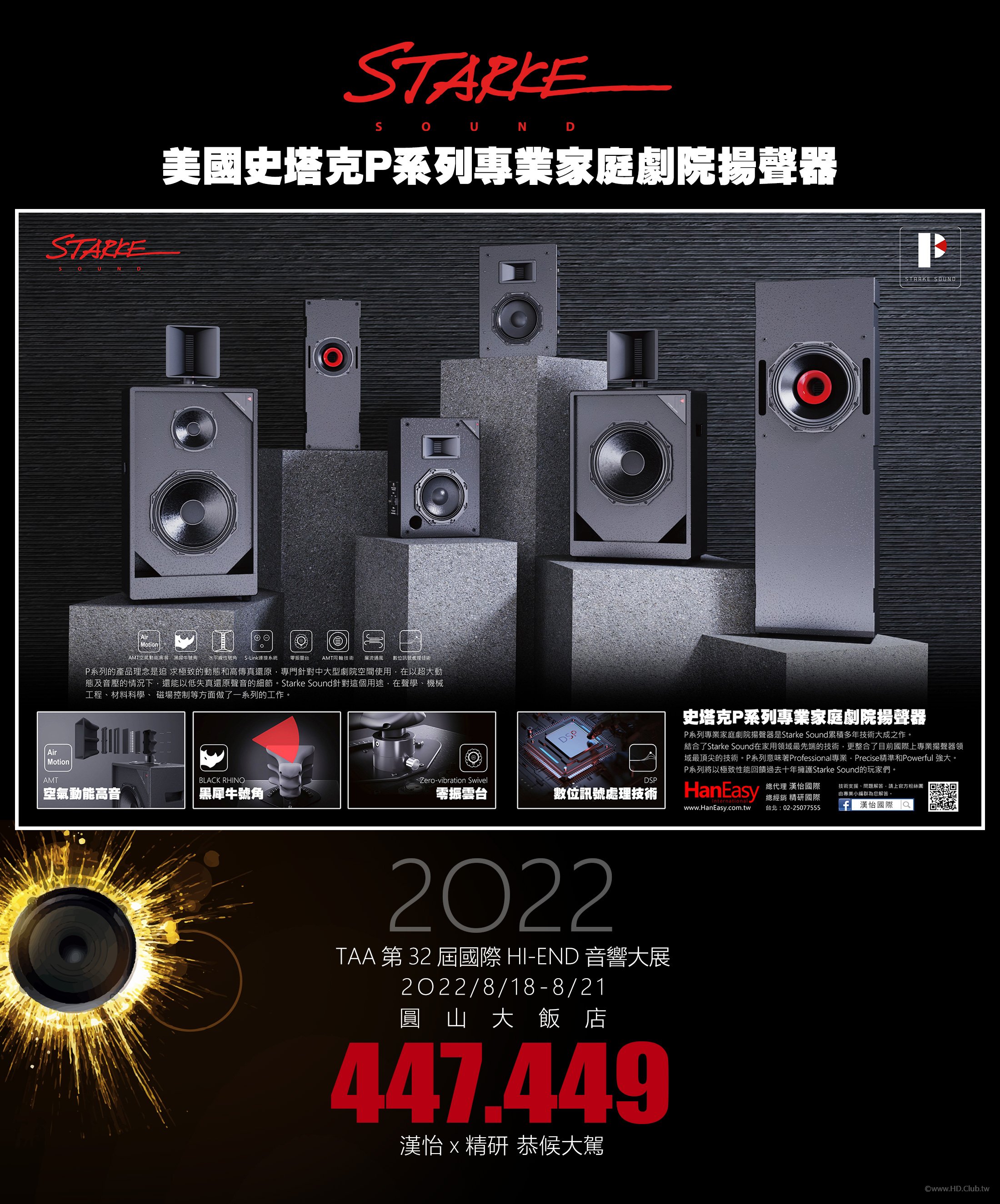 現場將以法國Storm Audio 最新前級處理,透過Starke A7 MKII 480推動Starke P系列旗艦喇叭及DXD1000 推挽堆疊Dolby Atmos、AURO-3D、IMAX Enhanced動態展出。