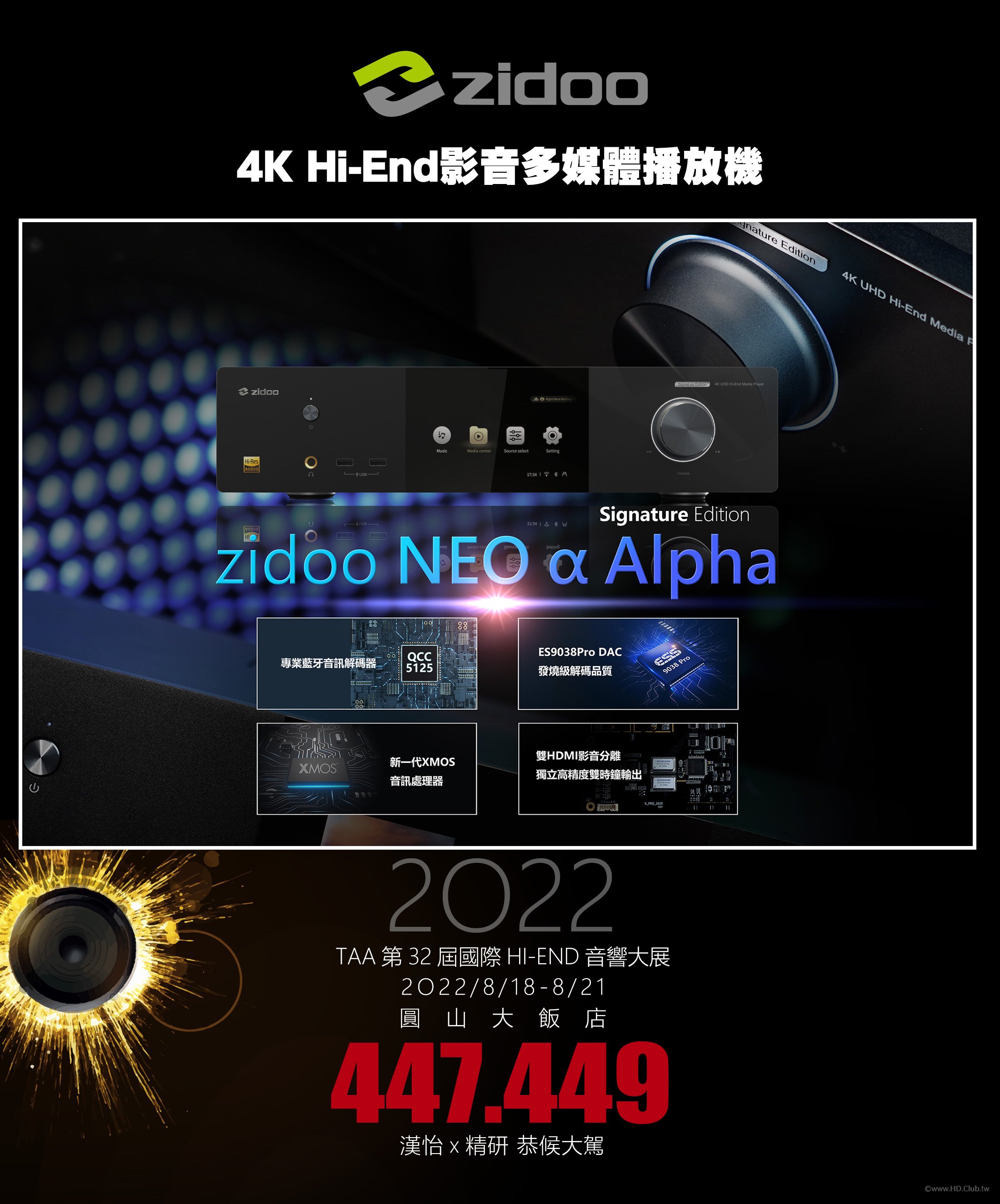 此外還有zidoo最新旗艦力作NEO-Alpha發燒級多媒體播放機,搭配Accuphase旗艦前後級推動KK K700pro/S150 25周年紀念版本完美的演出,還有您必須親眼見證BT2020色域高達114%的堅果U2三色雷射超短焦投影電視,為您展開新視界!