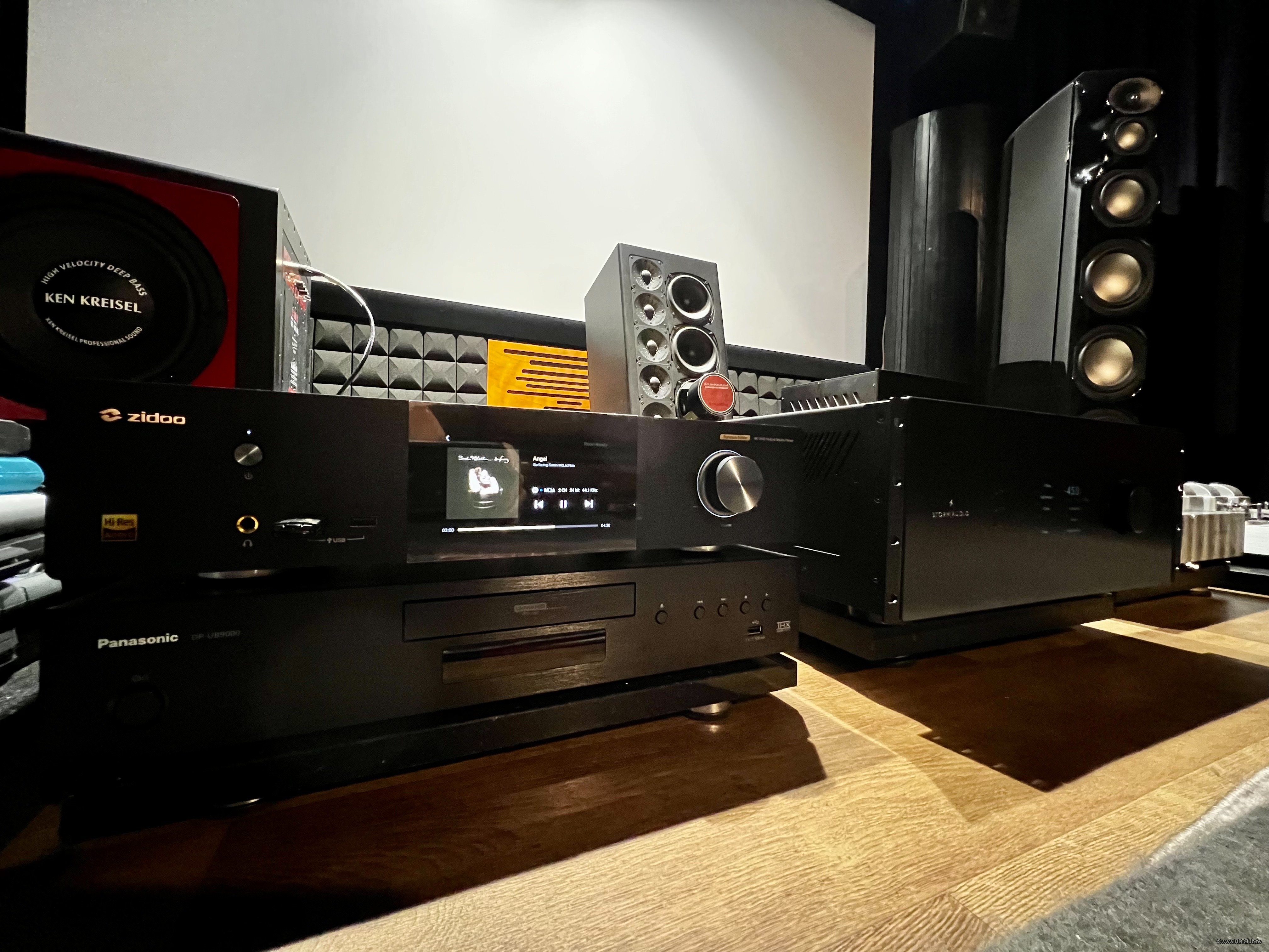 前置主喇叭Revel Salon 2,中置喇叭KK K700 Pro,左右環繞KK K700,後置環繞喇叭KK K700 Pro