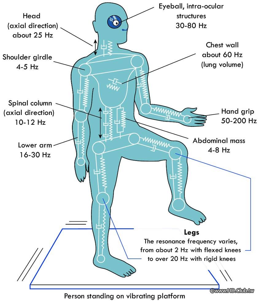 以前目標很宏大以為超低音大顆,加上低管就可以把曲線拉平,結果並非如此…..「超低音擺放」還是占了絕對的因素,認清「客廳黨」的難處後把曲線目標放低,以圖片中人體共振頻率大約30-80HZ為拉平目標!