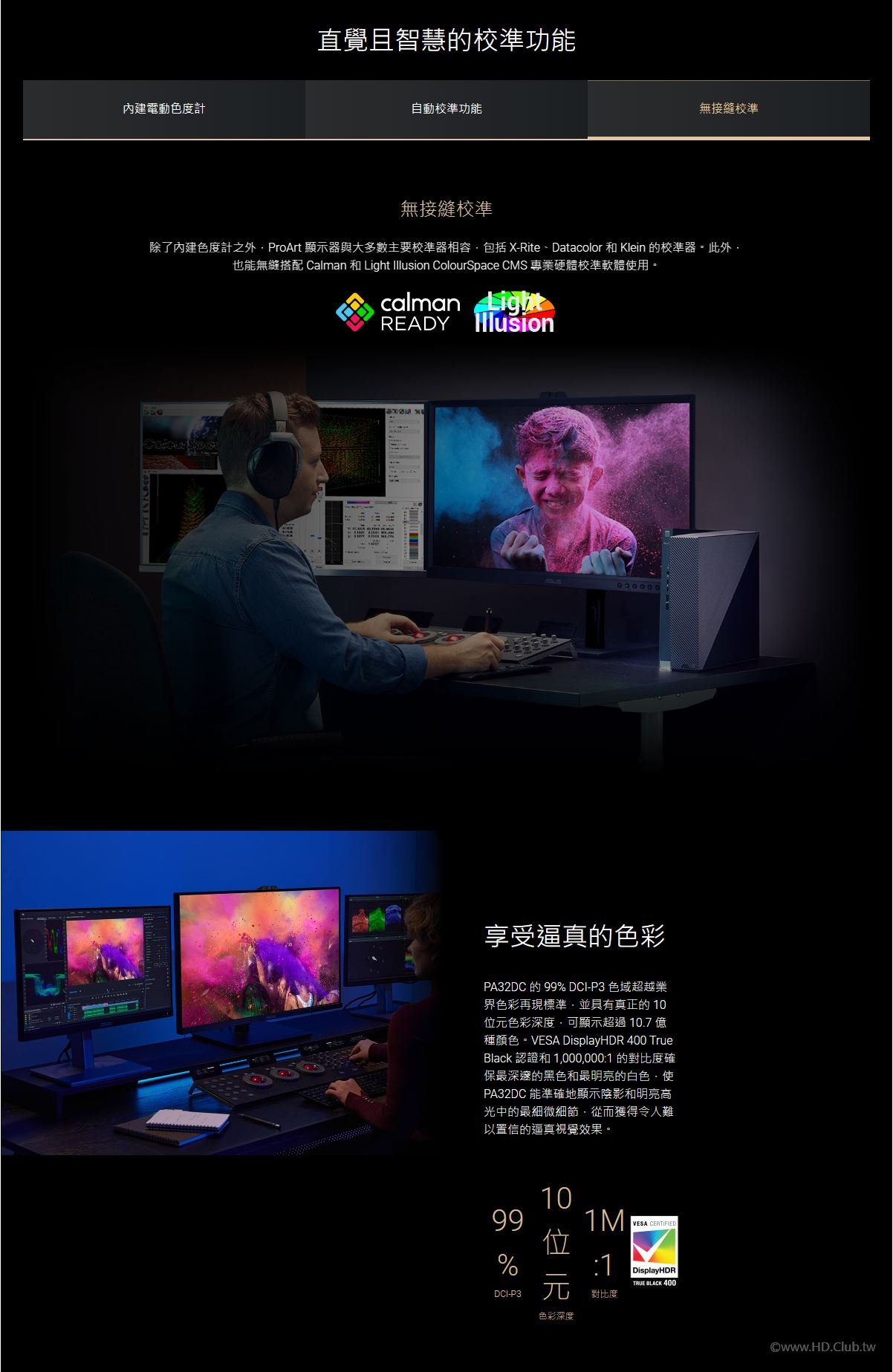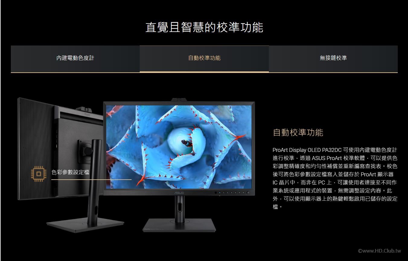 ASUS ProArt PA32DC為世界首款具備自動校準功能的 OLED 顯示器。還具備內建的電動翻轉色度計,以確保專業級的色彩準確性。此款 31.5 吋 4K HDR 顯示器使用先進的 OLED 面板,具備純 RGB 燈條和 99% DCI-P3 涵蓋範圍,可提供極為準確的色彩,為您的創作展現最細膩的細節。支援多種 HDR 格式可為創作者提供理想的平台,以製作動態的 HDR 內容。為提供舒適性和便利性,PA32DC 包含兩種支架以適應任何檢視位置或工作環境。