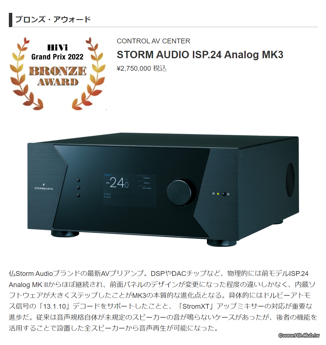 恭喜風暴StormAudio ISP.24 MK3獲日本第38回HiVi Grand Prix大獎