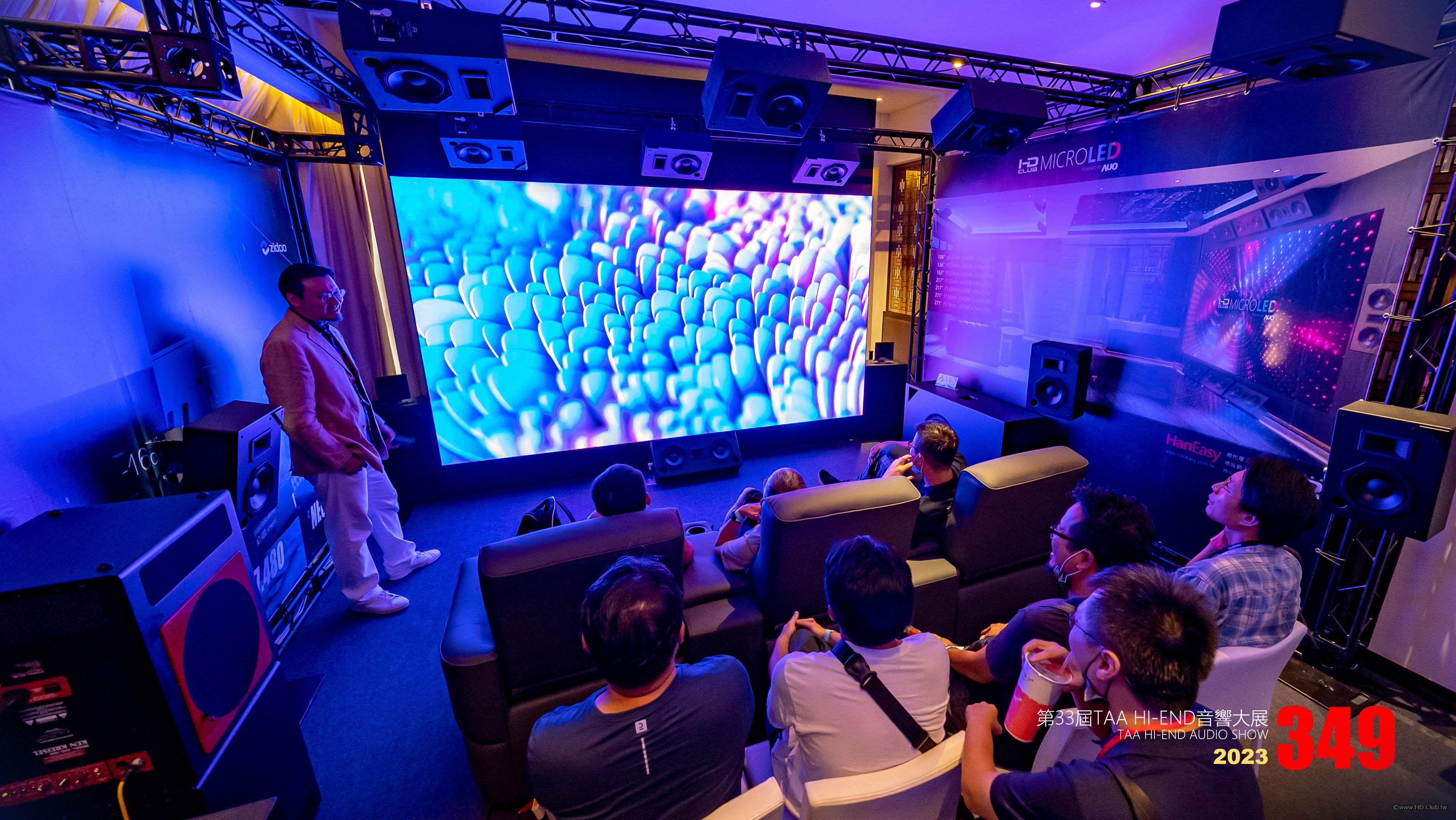 不過,在我們所有同事們的努力下,也算順利開展了。排除萬難地從我辦公室帶來的163吋MicroLED就是希望大家能親眼目睹,一起見證歷史。我們所代理的法國StormAudio 也在Dirac Live技術支援下,在圓山飯店不是很完美地聲學空間中,發揮地極大的效果。當然全場18聲道所使用的Starke Sound P系列的氣動式高音有不少助力,而負責播放影音任務zidoo NEO:Alpha多媒體播放機,每天長時間不停的播放出高水準的影音效果也是很大的功臣。還有最辛苦的Daniel甚至調音到開展前的黎明4點,為的就是希望把最好的成果呈現給大家。