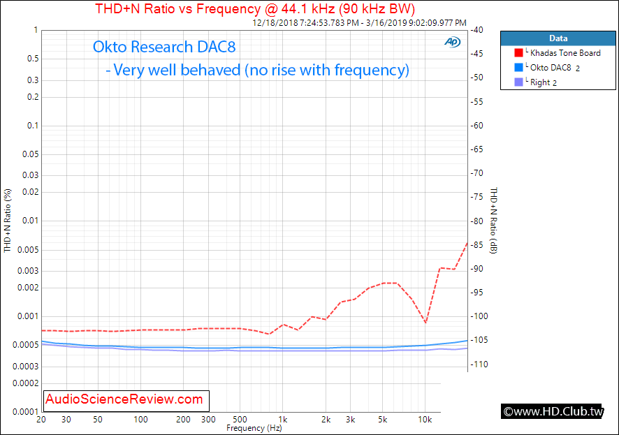 在20 kHz時,失真降低了大約30 dB,你確實因為花費超過99美元購買你的DAC(即:Khadas Tone Board)而獲得了一些東西。