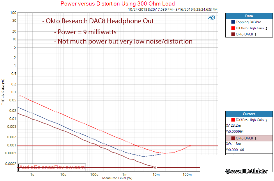 從失真和噪聲的角度來看,DAC8即使在低增益模式下也輕鬆超越了我的DX3 Pro參考。遺憾的是,由於最大輸出僅為1.6伏特,功率非常有限。因此,我們甚至沒有達到10毫瓦。那些擁有DX3 Pro並且在低增益模式下運行它的用戶,在這裡將擁有幾乎相同量的功率。