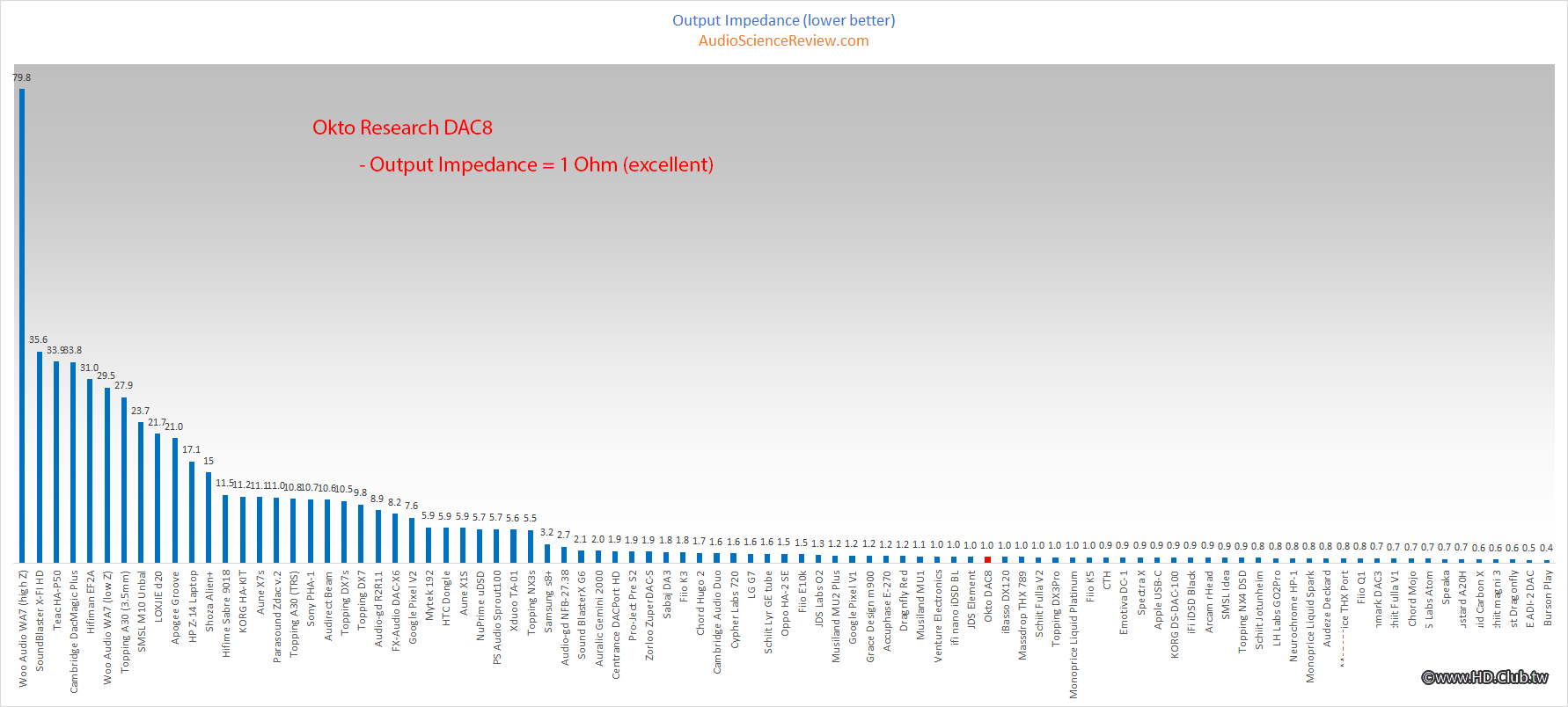 不過說實話,這裡有一個不公平的優勢。你發現了嗎?輸出電壓是3.3伏特,不是我們喜歡看到的慣用的4伏特。Okto表示他們可以根據需求將這個輸出值設定進行客制。通常當電平增加時會出現失真,所以如果這被提升到4伏特,我預計會有些性能損失。幸運的是,在使用中你不會需要更多電壓,因為你有DAC8的音量控制,無論如何都會以低於這些電平值驅動擴大機。