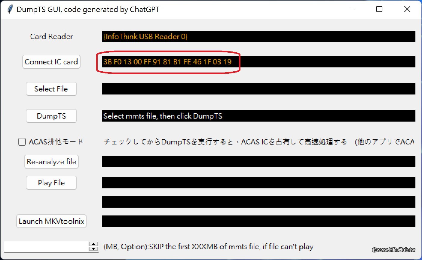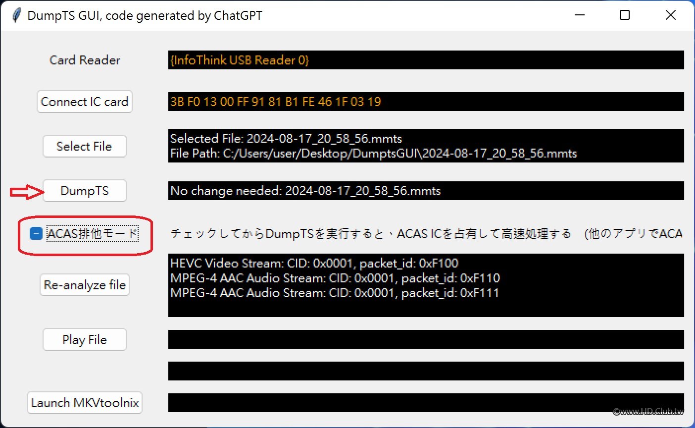 執行後按下 Select File 選擇 PT4K 錄下的 mmts 檔案, 然後勾選 "ACAS排他" 之後按下 DumpTS
