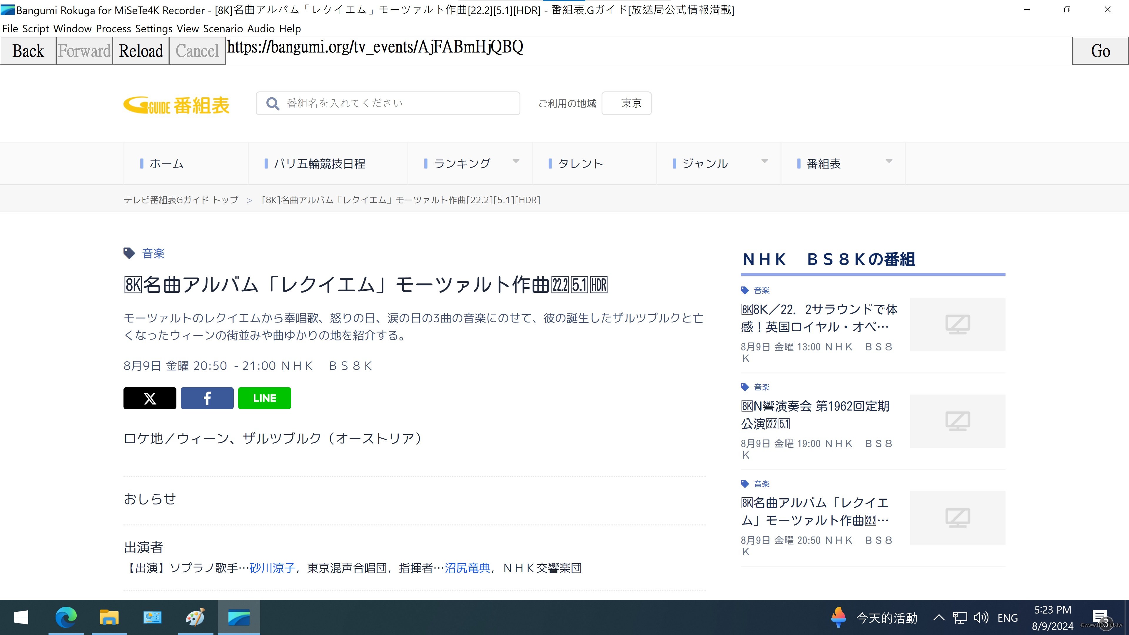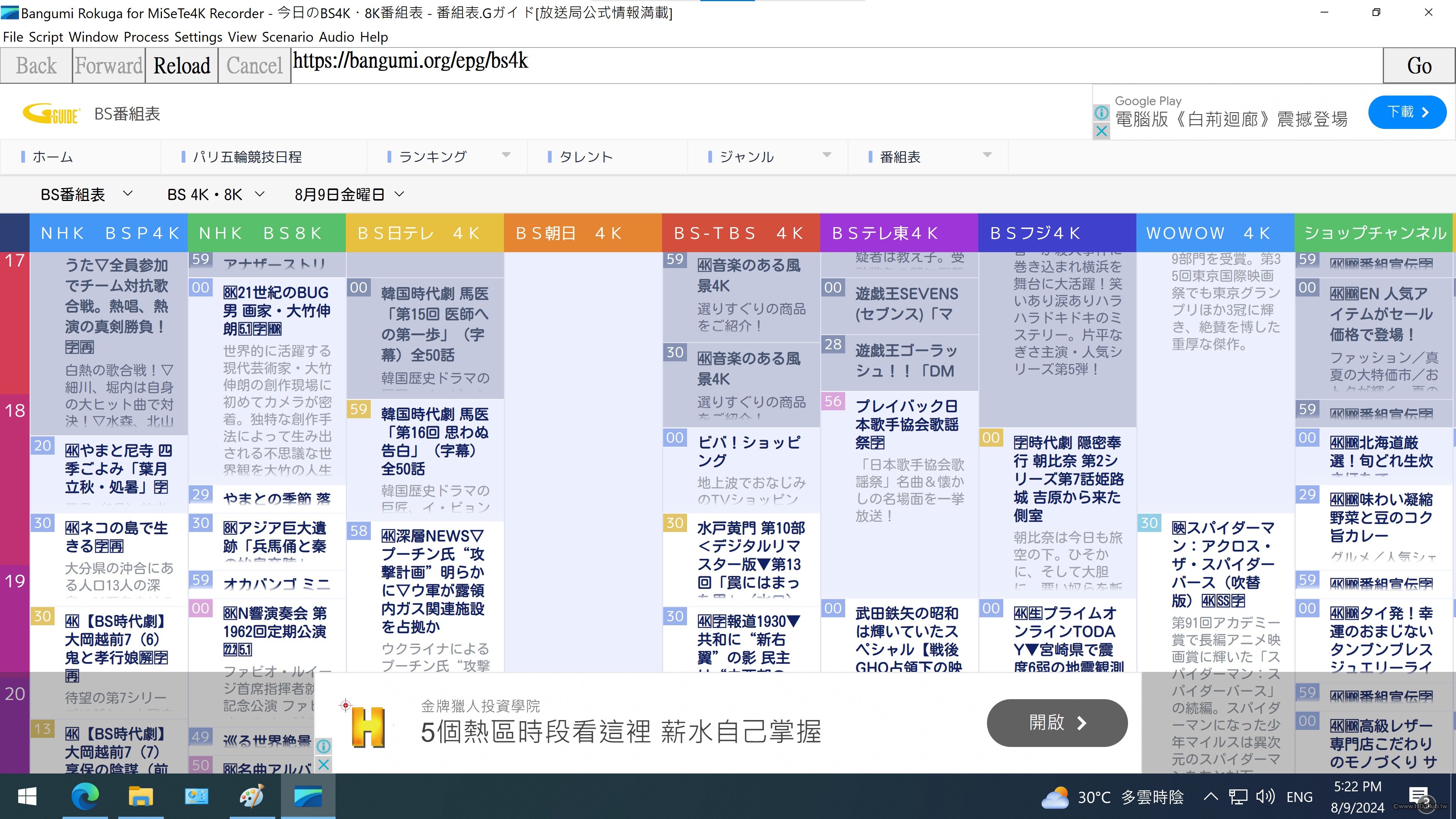 下載解開後, 裡面有一個 BangumiRokuga.exe , 執行之後會開啟 BS4K/8K 頻道的線上電子節目表