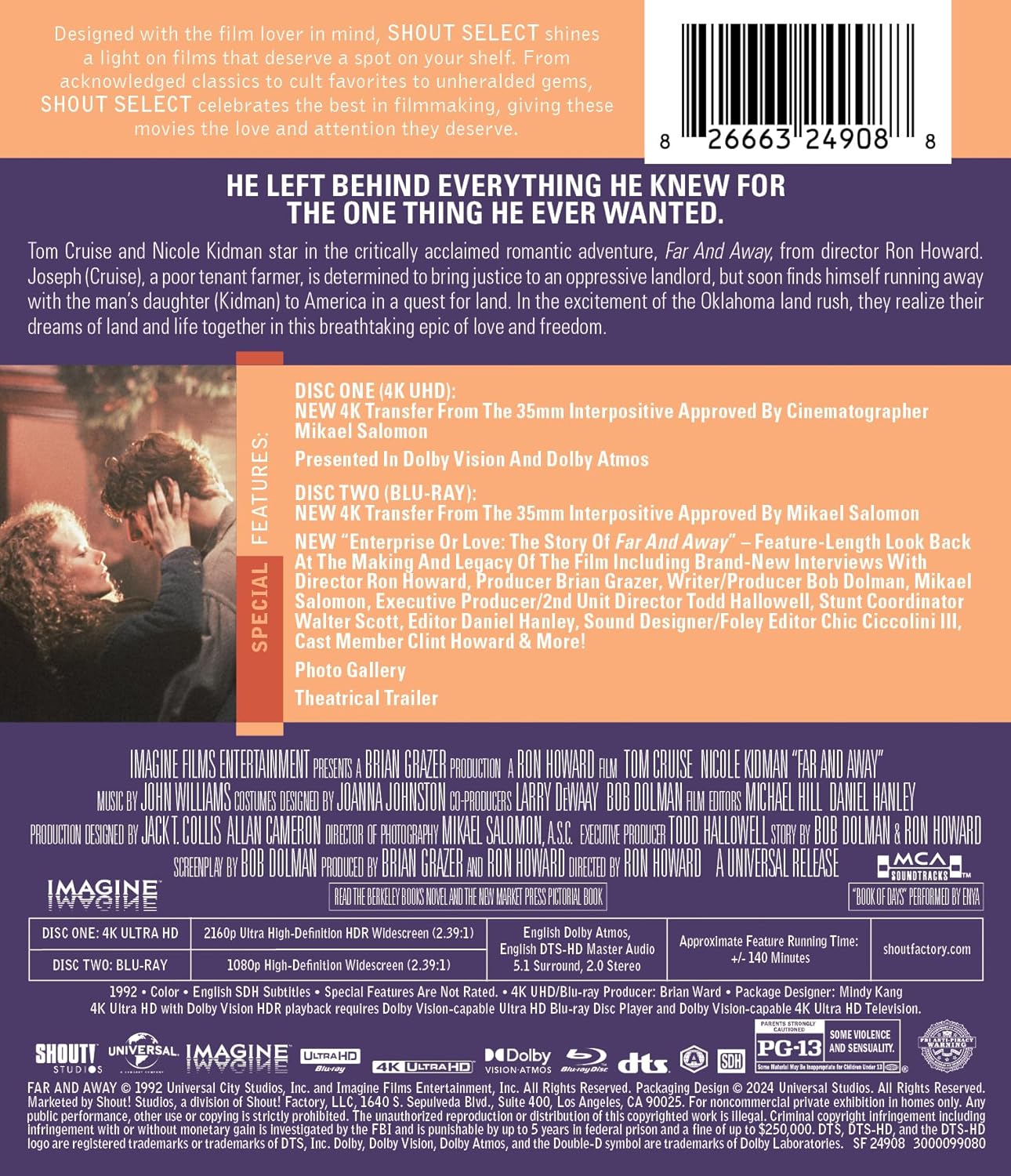 • NEW “Enterprise Or Love: The Story Of Far And Away” – A Feature-Length Look Back At The Making And Legacy Of The Film Including Brand-New Interviews With Director Ron Howard, Producer Brian Grazer, Writer Bob Dolman, Cinematographer Mikael Salomon, Executive Producer/2nd Unit Director Todd Hallowell, Stunt Coordinator Walter Scott, Editor Daniel Hanley, Sound Designer/Foley Editor Chic Ciccolini III, Cast Member Clint Howard, And More!