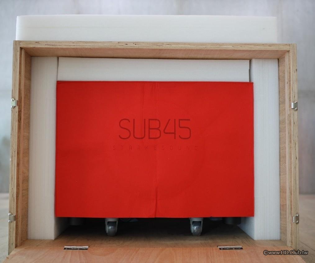 可以輕鬆移動的重砲對聲音有一定要求的發燒友,都想透過移動單隻或多隻超低音,在有限的空間結構裡尋找到一個相對平直的頻響曲線甚至結合Waterfall的衰減效果來處理。這次筆者試聽到的這款超低音名為StarkeSound SUB45,三組的一主動兩被動設計,使用H類擴大機驅動,達到2500WRMS功率,箱體碩大,淨重92.1kg。你沒看錯參數,是92.1kg!