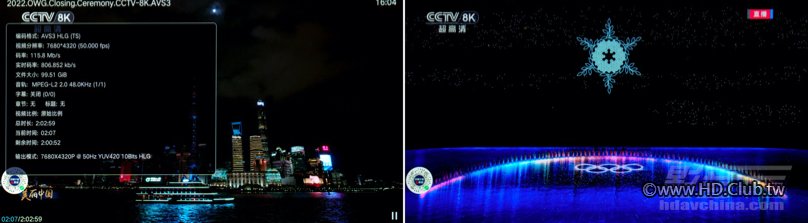 測試片源:CCTV 8K頻道2022年北京冬奧閉幕式8K測試片段 影片編碼:AVS3 視訊規格:7680×4320 @ 50fps 資料傳輸速率:120Mbps左右 HDR規格:HLG 播放效果:正確辨識與播放此8K測試片段,包括AVS3編碼格式、畫面解析度、影格率與HLG格式,播放流暢順暢,色彩還原準確,能滿足國內8K超高清電視廣播的播放需求。
