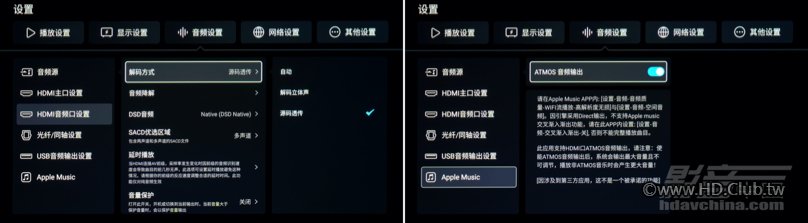在HDMI音訊口設定方面的功能非常細緻,包括解碼、DSD音訊、縮時播放、音量保護等,同時也支援Apple Music應用程式中開啟Dolby Atmos音訊輸出