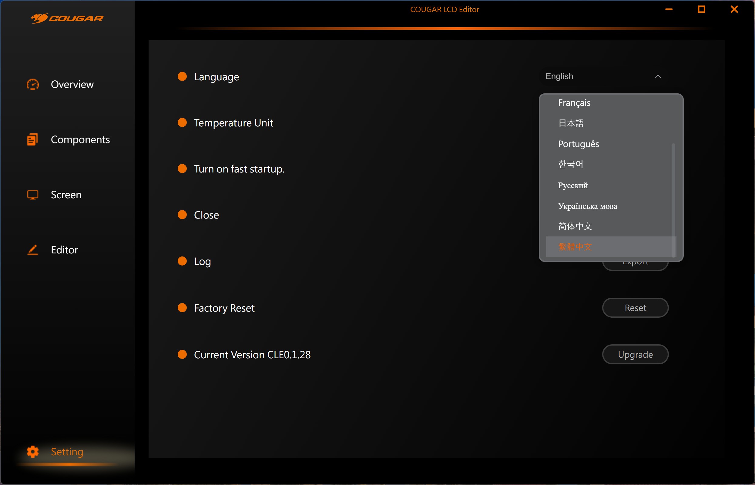 ▲再來談談軟體操作的部分,在官網上的產品頁面中就能馬上看到「下載 COUGAR LCD 編輯軟體」連結,檔案大小並不大,只有 168MB,安裝也很快,無腦下一步就好;開啟軟體後的第一步,就是先到左下角的 Setting,在 Language 語言中改成繁體中文~
