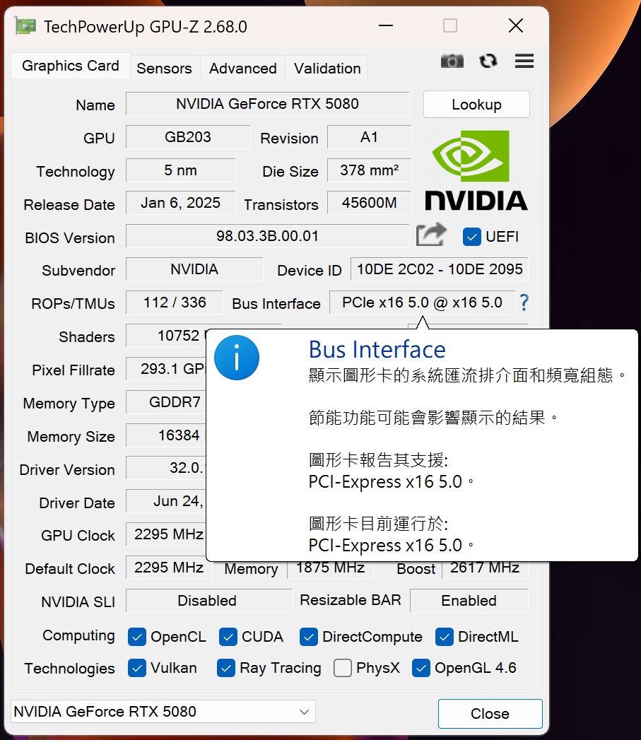 ▲裝機搭配的部分相信之後有機會可以再展示一下,先來看看大家最關注且質疑的效能衰退問題!首先用 GPU-Z 來看一下頻寬,確定是運行在 PCIe 5.0 x16