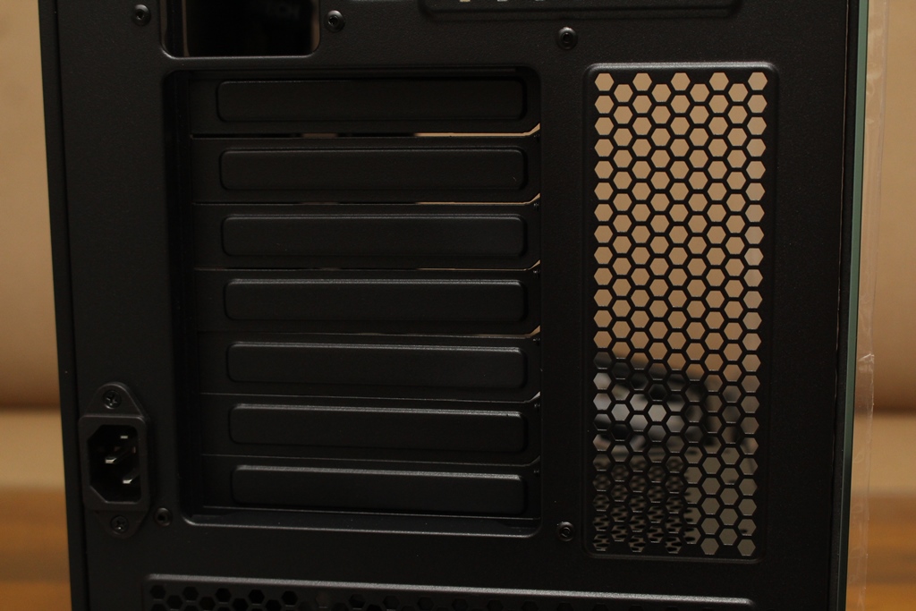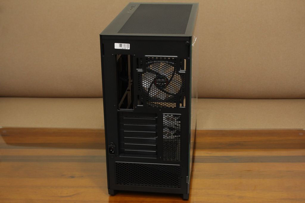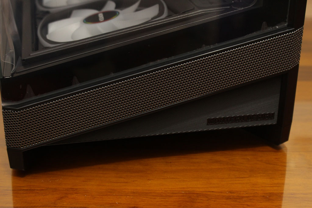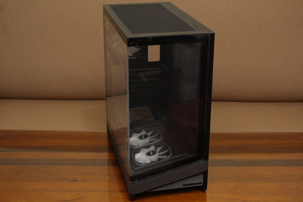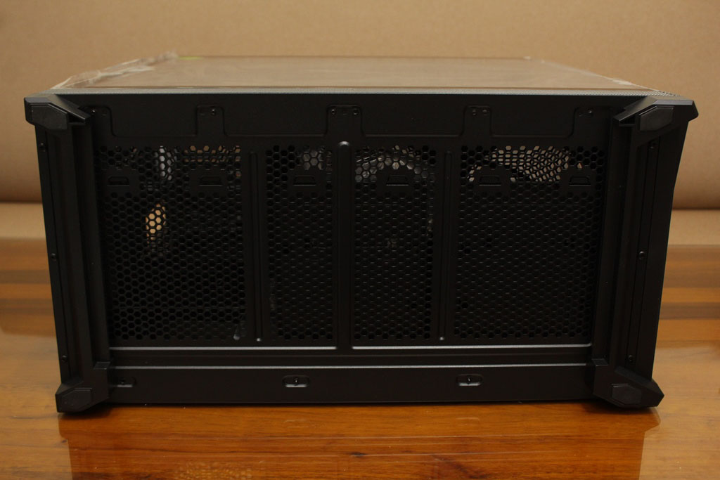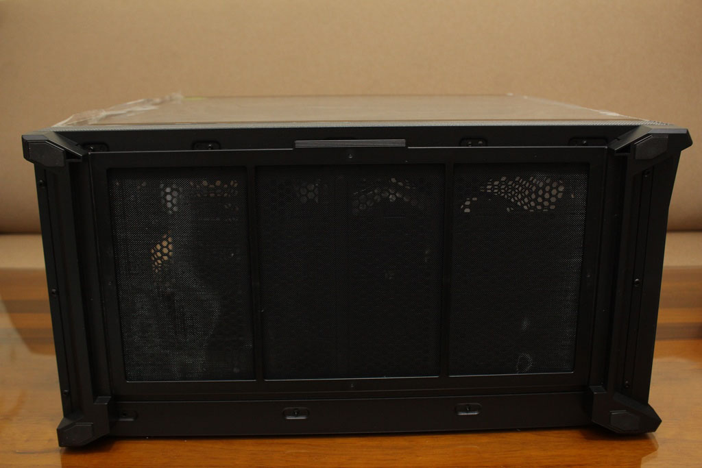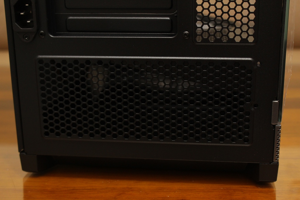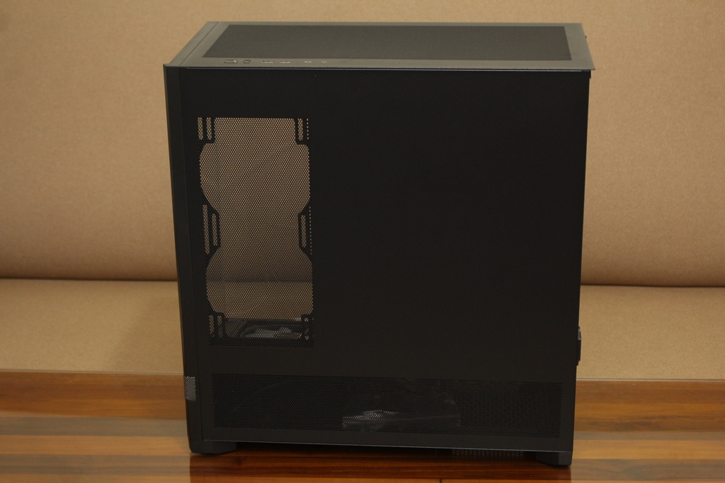 ▼兩側一覽,一側為鋼化玻璃,另一側為鋼板設計,鋼板面前方與下方有大面積散熱開孔,讓內部有更好的散熱效果